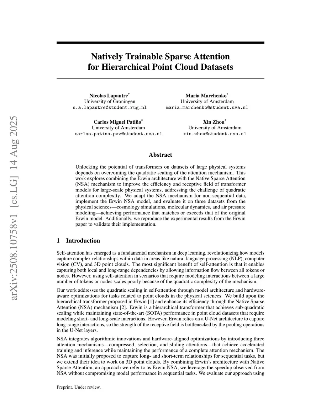 Unlocking the potential of transformers on datasets of large physical systems depends on overcoming the quadratic scaling of the attention mechanism. This work explores combining the Erwin architecture with the Native Sparse Attention (NSA) mechanism to improve the efficiency and receptive field of transformer models for large-scale physical systems, addressing the challenge of quadratic attention complexity. We adapt the NSA mechanism for non-sequential data, implement the Erwin NSA model, and evaluate it on three datasets from the physical sciences -- cosmology simulations, molecular dynamics, and air pressure modeling -- achieving performance that matches or exceeds that of the original Erwin model. Additionally, we reproduce the experimental results from the Erwin paper to validate their implementation.