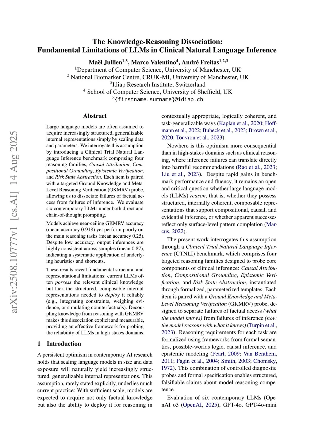 Large language models are often assumed to acquire increasingly structured, generalizable internal representations simply by scaling data and parameters. We interrogate this assumption by introducing a Clinical Trial Natural Language Inference benchmark comprising four reasoning families, Causal Attribution, Compositional Grounding, Epistemic Verification, and Risk State Abstraction. Each item is paired with a targeted Ground Knowledge and Meta-Level Reasoning Verification (GKMRV) probe, allowing us to dissociate failures of factual access from failures of inference. We evaluate six contemporary LLMs under both direct and chain of thought prompting.Models achieve near-ceiling GKMRV accuracy (mean accuracy 0.918) yet perform poorly on the main reasoning tasks (mean accuracy 0.25). Despite low accuracy, output inferences are highly consistent across samples (mean 0.87), indicating a systematic application of underlying heuristics and shortcuts.These results reveal fundamental structural and representational limitations: current LLMs often possess the relevant clinical knowledge but lack the structured, composable internal representations needed to deploy it reliably (e.g., integrating constraints, weighing evidence, or simulating counterfactuals). Decoupling knowledge from reasoning with GKMRV makes this dissociation explicit and measurable, providing an effective framework for probing the reliability of LLMs in high-stakes domains.