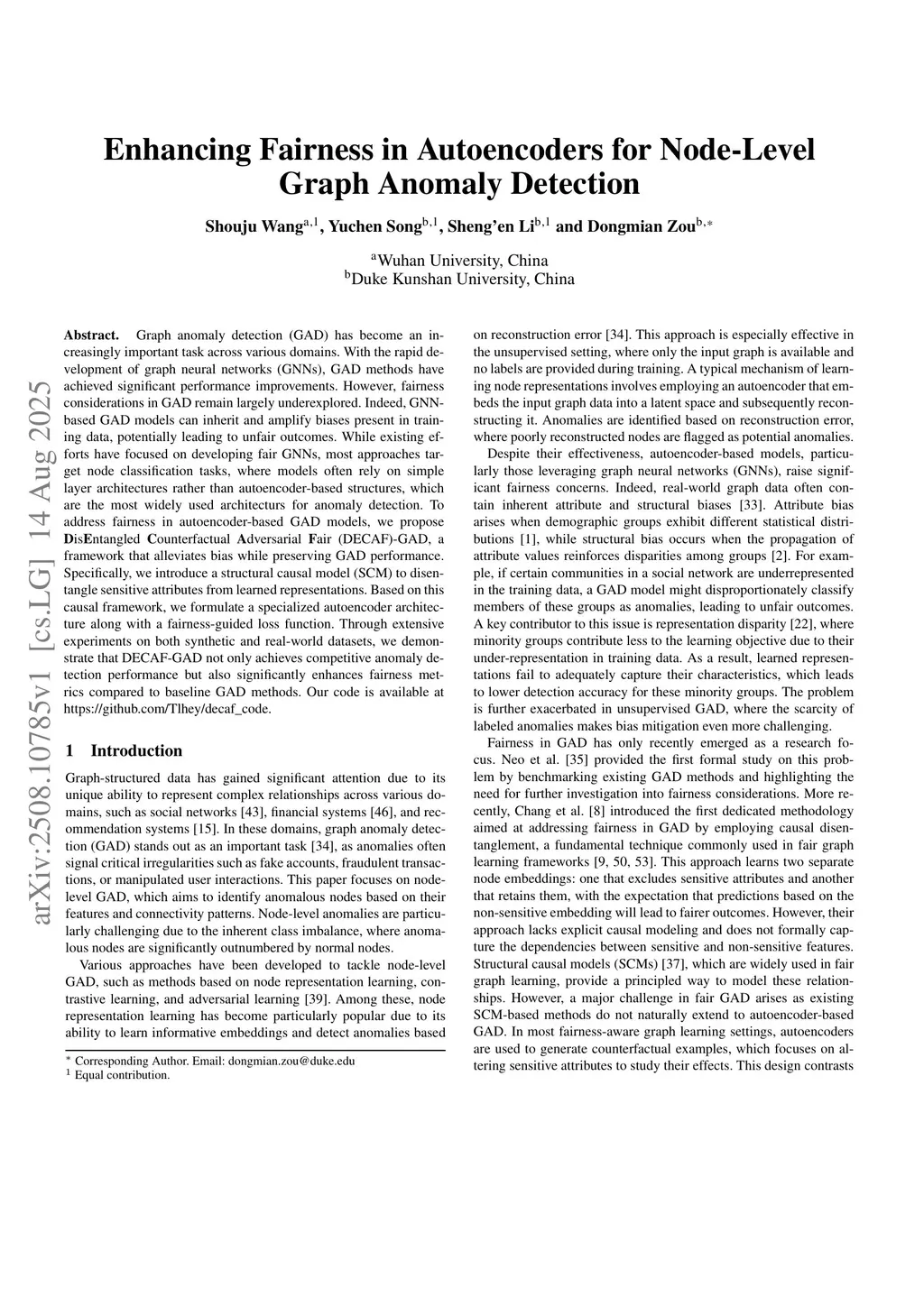 Graph anomaly detection (GAD) has become an increasingly important task across various domains. With the rapid development of graph neural networks (GNNs), GAD methods have achieved significant performance improvements. However, fairness considerations in GAD remain largely underexplored. Indeed, GNN-based GAD models can inherit and amplify biases present in training data, potentially leading to unfair outcomes. While existing efforts have focused on developing fair GNNs, most approaches target node classification tasks, where models often rely on simple layer architectures rather than autoencoder-based structures, which are the most widely used architecturs for anomaly detection. To address fairness in autoencoder-based GAD models, we propose \textbf{D}is\textbf{E}ntangled \textbf{C}ounterfactual \textbf{A}dversarial \textbf{F}air (DECAF)-GAD, a framework that alleviates bias while preserving GAD performance. Specifically, we introduce a structural causal model (SCM) to disentangle sensitive attributes from learned representations. Based on this causal framework, we formulate a specialized autoencoder architecture along with a fairness-guided loss function. Through extensive experiments on both synthetic and real-world datasets, we demonstrate that DECAF-GAD not only achieves competitive anomaly detection performance but also significantly enhances fairness metrics compared to baseline GAD methods. Our code is available atthis https URL.