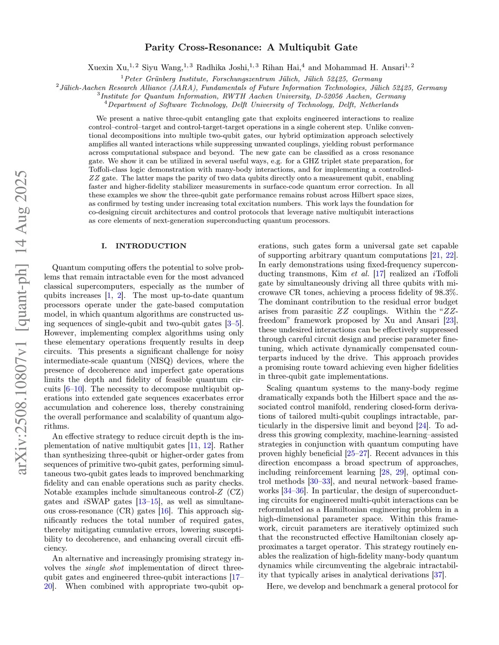We present a native three-qubit entangling gate that exploits engineered interactions to realize control-control-target and control-target-target operations in a single coherent step. Unlike conventional decompositions into multiple two-qubit gates, our hybrid optimization approach selectively amplifies desired interactions while suppressing unwanted couplings, yielding robust performance across the computational subspace and beyond. The new gate can be classified as a cross-resonance gate. We show it can be utilized in several ways, for example, in GHZ triplet state preparation, Toffoli-class logic demonstrations with many-body interactions, and in implementing a controlled-ZZ gate. The latter maps the parity of two data qubits directly onto a measurement qubit, enabling faster and higher-fidelity stabilizer measurements in surface-code quantum error correction. In all these examples, we show that the three-qubit gate performance remains robust across Hilbert space sizes, as confirmed by testing under increasing total excitation numbers. This work lays the foundation for co-designing circuit architectures and control protocols that leverage native multiqubit interactions as core elements of next-generation superconducting quantum processors.