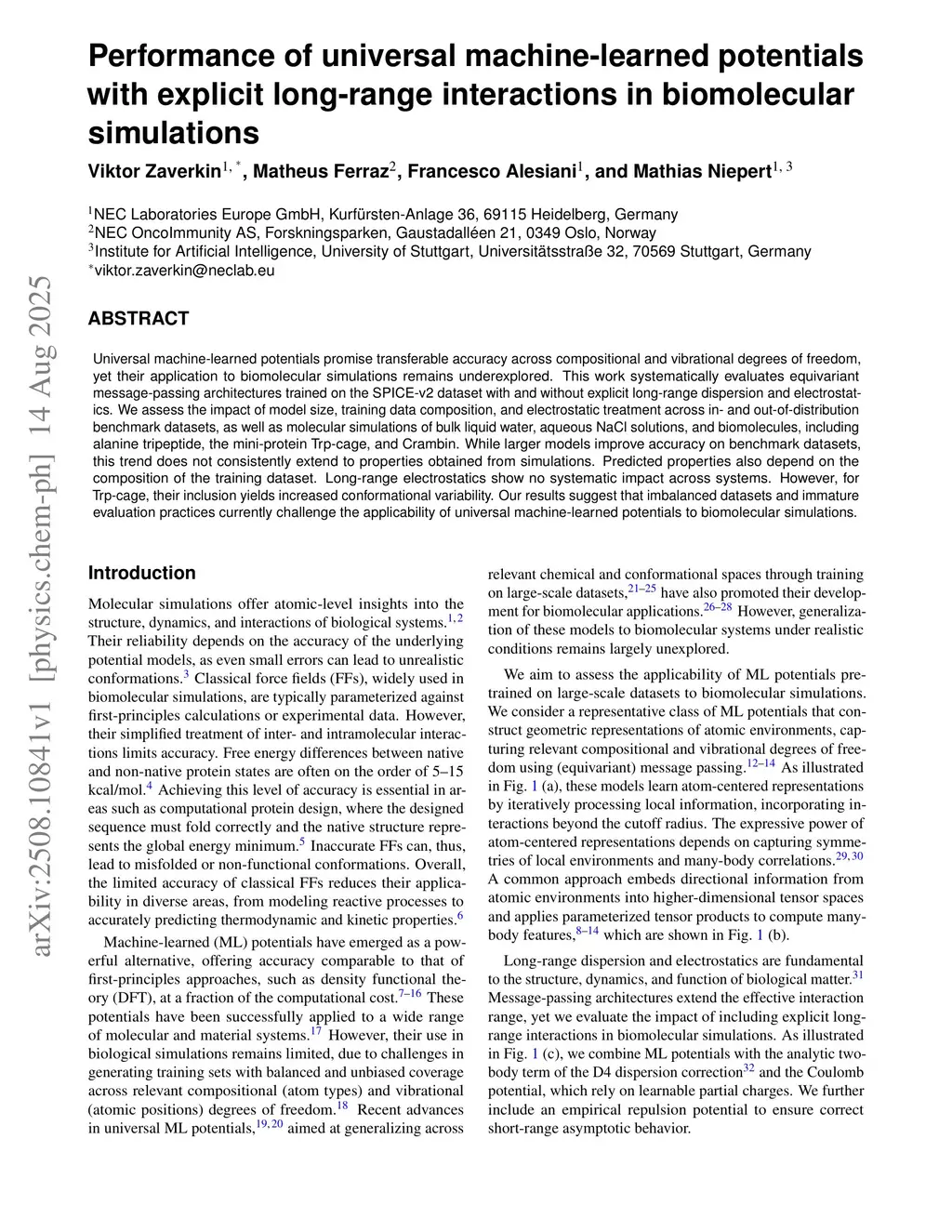 Universal machine-learned potentials promise transferable accuracy across compositional and vibrational degrees of freedom, yet their application to biomolecular simulations remains underexplored. This work systematically evaluates equivariant message-passing architectures trained on the SPICE-v2 dataset with and without explicit long-range dispersion and electrostatics. We assess the impact of model size, training data composition, and electrostatic treatment across in- and out-of-distribution benchmark datasets, as well as molecular simulations of bulk liquid water, aqueous NaCl solutions, and biomolecules, including alanine tripeptide, the mini-protein Trp-cage, and Crambin. While larger models improve accuracy on benchmark datasets, this trend does not consistently extend to properties obtained from simulations. Predicted properties also depend on the composition of the training dataset. Long-range electrostatics show no systematic impact across systems. However, for Trp-cage, their inclusion yields increased conformational variability. Our results suggest that imbalanced datasets and immature evaluation practices currently challenge the applicability of universal machine-learned potentials to biomolecular simulations.