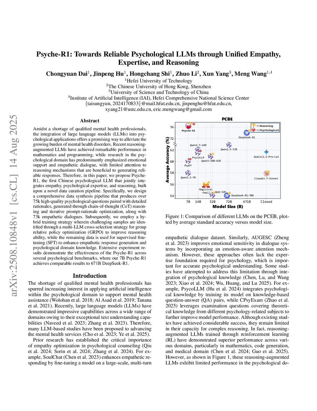 Amidst a shortage of qualified mental health professionals, the integration of large language models (LLMs) into psychological applications offers a promising way to alleviate the growing burden of mental health disorders. Recent reasoning-augmented LLMs have achieved remarkable performance in mathematics and programming, while research in the psychological domain has predominantly emphasized emotional support and empathetic dialogue, with limited attention to reasoning mechanisms that are beneficial to generating reliable responses. Therefore, in this paper, we propose Psyche-R1, the first Chinese psychological LLM that jointly integrates empathy, psychological expertise, and reasoning, built upon a novel data curation pipeline. Specifically, we design a comprehensive data synthesis pipeline that produces over 75k high-quality psychological questions paired with detailed rationales, generated through chain-of-thought (CoT) reasoning and iterative prompt-rationale optimization, along with 73k empathetic dialogues. Subsequently, we employ a hybrid training strategy wherein challenging samples are identified through a multi-LLM cross-selection strategy for group relative policy optimization (GRPO) to improve reasoning ability, while the remaining data is used for supervised fine-tuning (SFT) to enhance empathetic response generation and psychological domain knowledge. Extensive experiment results demonstrate the effectiveness of the Psyche-R1 across several psychological benchmarks, where our 7B Psyche-R1 achieves comparable results to 671B DeepSeek-R1.