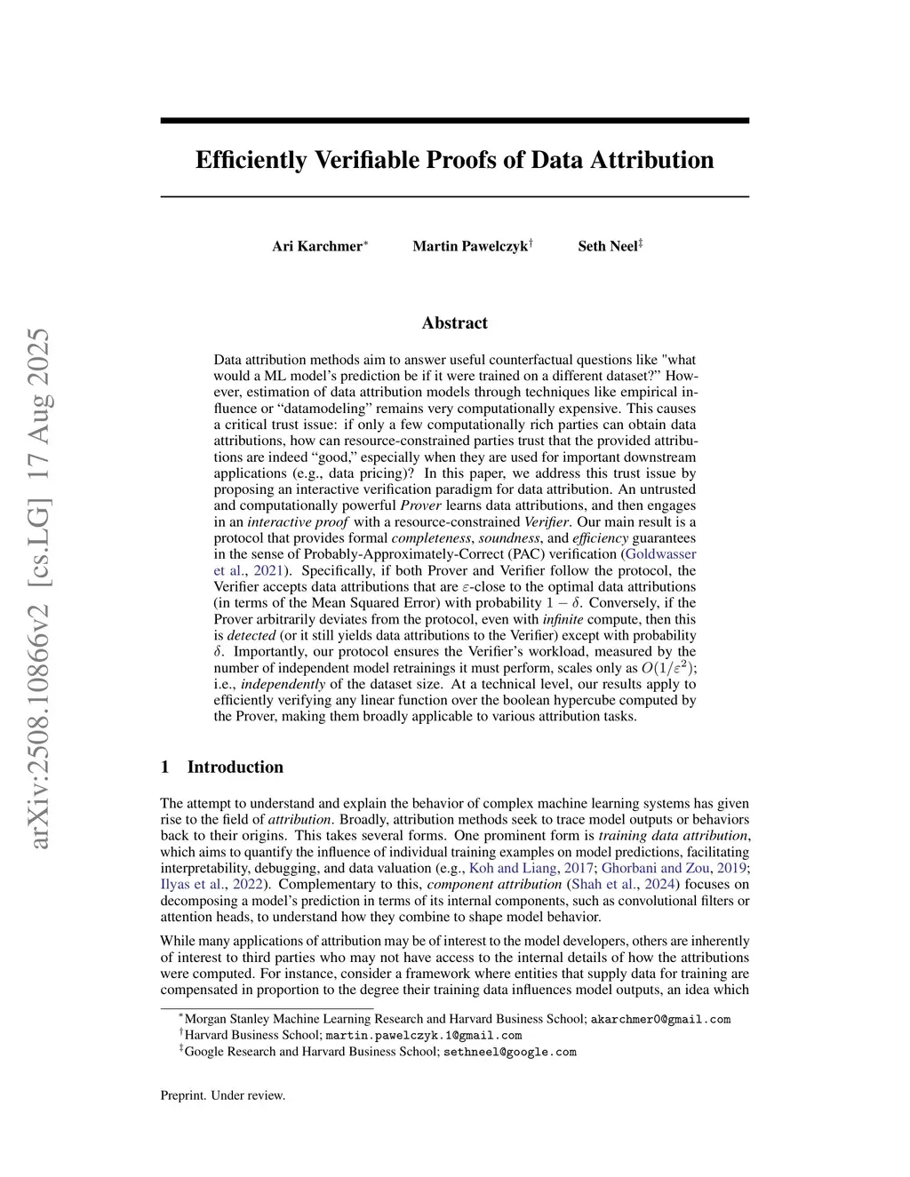 Data attribution methods aim to answer useful counterfactual questions like "what would a ML model's prediction be if it were trained on a different dataset?" However, estimation of data attribution models through techniques like empirical influence or "datamodeling" remains very computationally expensive. This causes a critical trust issue: if only a few computationally rich parties can obtain data attributions, how can resource-constrained parties trust that the provided attributions are indeed "good," especially when they are used for important downstream applications (e.g., data pricing)? In this paper, we address this trust issue by proposing an interactive verification paradigm for data attribution. An untrusted and computationally powerful Prover learns data attributions, and then engages in an interactive proof with a resource-constrained Verifier. Our main result is a protocol that provides formal completeness, soundness, and efficiency guarantees in the sense of Probably-Approximately-Correct (PAC) verification. Specifically, if both Prover and Verifier follow the protocol, the Verifier accepts data attributions that are {\epsilon}-close to the optimal data attributions (in terms of the Mean Squared Error) with probability 1-{\delta}. Conversely, if the Prover arbitrarily deviates from the protocol, even with infinite compute, then this is detected (or it still yields data attributions to the Verifier) except with probability {\delta}. Importantly, our protocol ensures the Verifier's workload, measured by the number of independent model retrainings it must perform, scales only as O(1/{\epsilon}); i.e., independently of the dataset size. At a technical level, our results apply to efficiently verifying any linear function over the boolean hypercube computed by the Prover, making them broadly applicable to various attribution tasks.