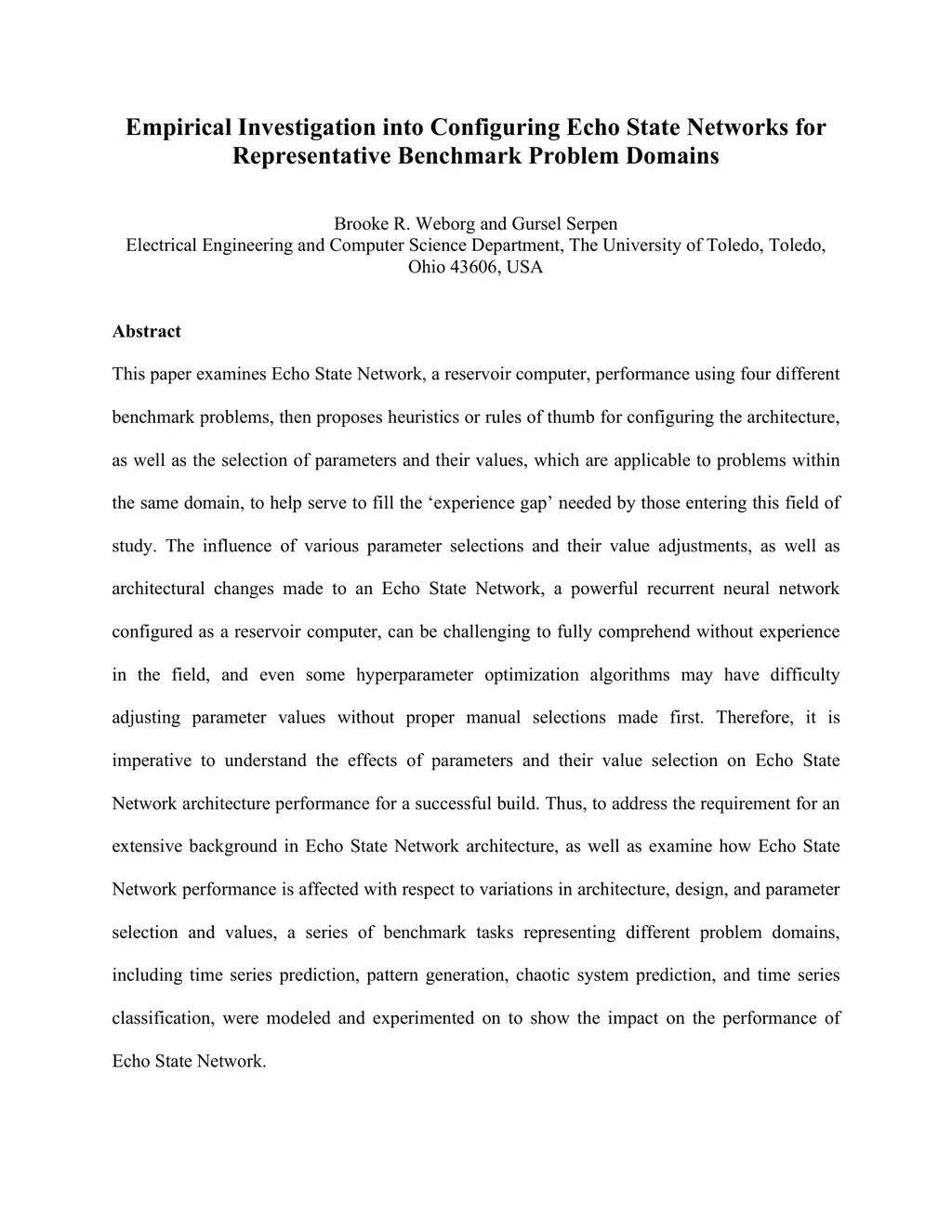 Empirical Investigation into Configuring Echo State Networks for Representative Benchmark Problem Domains