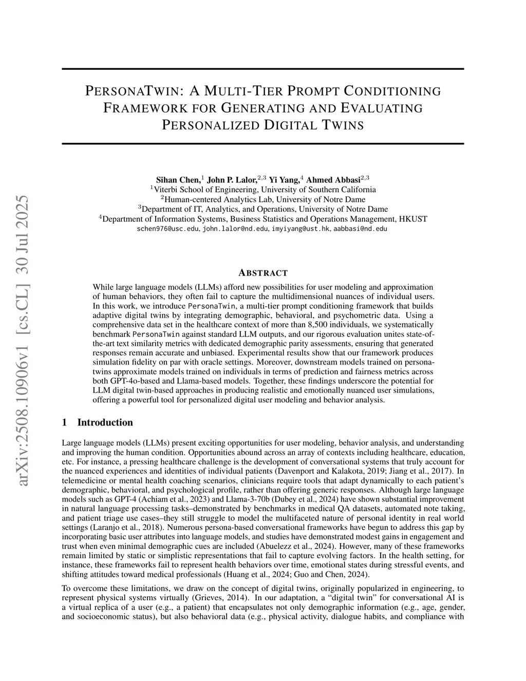 While large language models (LLMs) afford new possibilities for user modeling and approximation of human behaviors, they often fail to capture the multidimensional nuances of individual users. In this work, we introduce PersonaTwin, a multi-tier prompt conditioning framework that builds adaptive digital twins by integrating demographic, behavioral, and psychometric data. Using a comprehensive data set in the healthcare context of more than 8,500 individuals, we systematically benchmark PersonaTwin against standard LLM outputs, and our rigorous evaluation unites state-of-the-art text similarity metrics with dedicated demographic parity assessments, ensuring that generated responses remain accurate and unbiased. Experimental results show that our framework produces simulation fidelity on par with oracle settings. Moreover, downstream models trained on persona-twins approximate models trained on individuals in terms of prediction and fairness metrics across both GPT-4o-based and Llama-based models. Together, these findings underscore the potential for LLM digital twin-based approaches in producing realistic and emotionally nuanced user simulations, offering a powerful tool for personalized digital user modeling and behavior analysis.