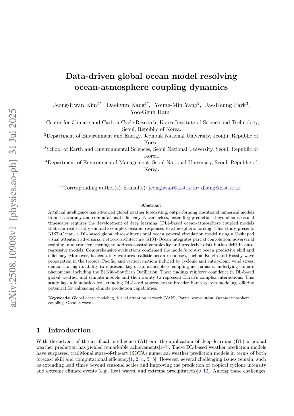 Artificial intelligence has advanced global weather forecasting, outperforming traditional numerical models in both accuracy and computational efficiency. Nevertheless, extending predictions beyond subseasonal timescales requires the development of deep learning (DL)-based ocean-atmosphere coupled models that can realistically simulate complex oceanic responses to atmospheric forcing. This study presents KIST-Ocean, a DL-based global three-dimensional ocean general circulation model using a U-shaped visual attention adversarial network architecture. KIST-Ocean integrates partial convolution, adversarial training, and transfer learning to address coastal complexity and predictive distribution drift in auto-regressive models. Comprehensive evaluations confirmed the model's robust ocean predictive skill and efficiency. Moreover, it accurately captures realistic ocean response, such as Kelvin and Rossby wave propagation in the tropical Pacific, and vertical motions induced by cyclonic and anticyclonic wind stress, demonstrating its ability to represent key ocean-atmosphere coupling mechanisms underlying climate phenomena, including the El Nino-Southern Oscillation. These findings reinforce confidence in DL-based global weather and climate models and their extending DL-based approaches to broader Earth system modeling, offering potential for enhancing climate prediction capabilities.