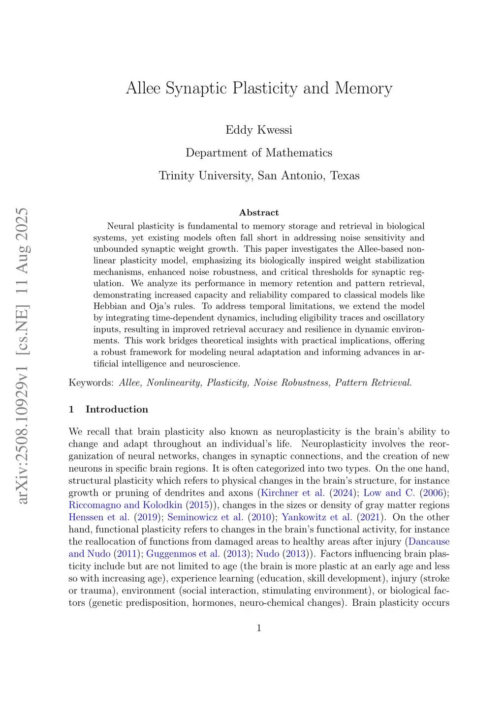 Neural plasticity is fundamental to memory storage and retrieval in biological systems, yet existing models often fall short in addressing noise sensitivity and unbounded synaptic weight growth. This paper investigates the Allee-based nonlinear plasticity model, emphasizing its biologically inspired weight stabilization mechanisms, enhanced noise robustness, and critical thresholds for synaptic regulation. We analyze its performance in memory retention and pattern retrieval, demonstrating increased capacity and reliability compared to classical models like Hebbian and Oja's rules. To address temporal limitations, we extend the model by integrating time-dependent dynamics, including eligibility traces and oscillatory inputs, resulting in improved retrieval accuracy and resilience in dynamic environments. This work bridges theoretical insights with practical implications, offering a robust framework for modeling neural adaptation and informing advances in artificial intelligence and neuroscience.