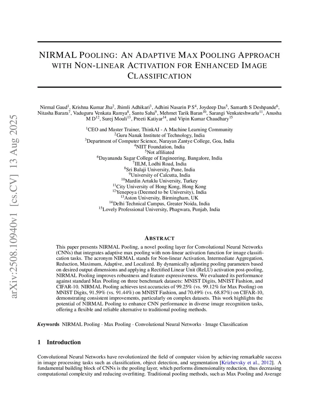 NIRMAL Pooling: An Adaptive Max Pooling Approach with Non-linear Activation for Enhanced Image Classification