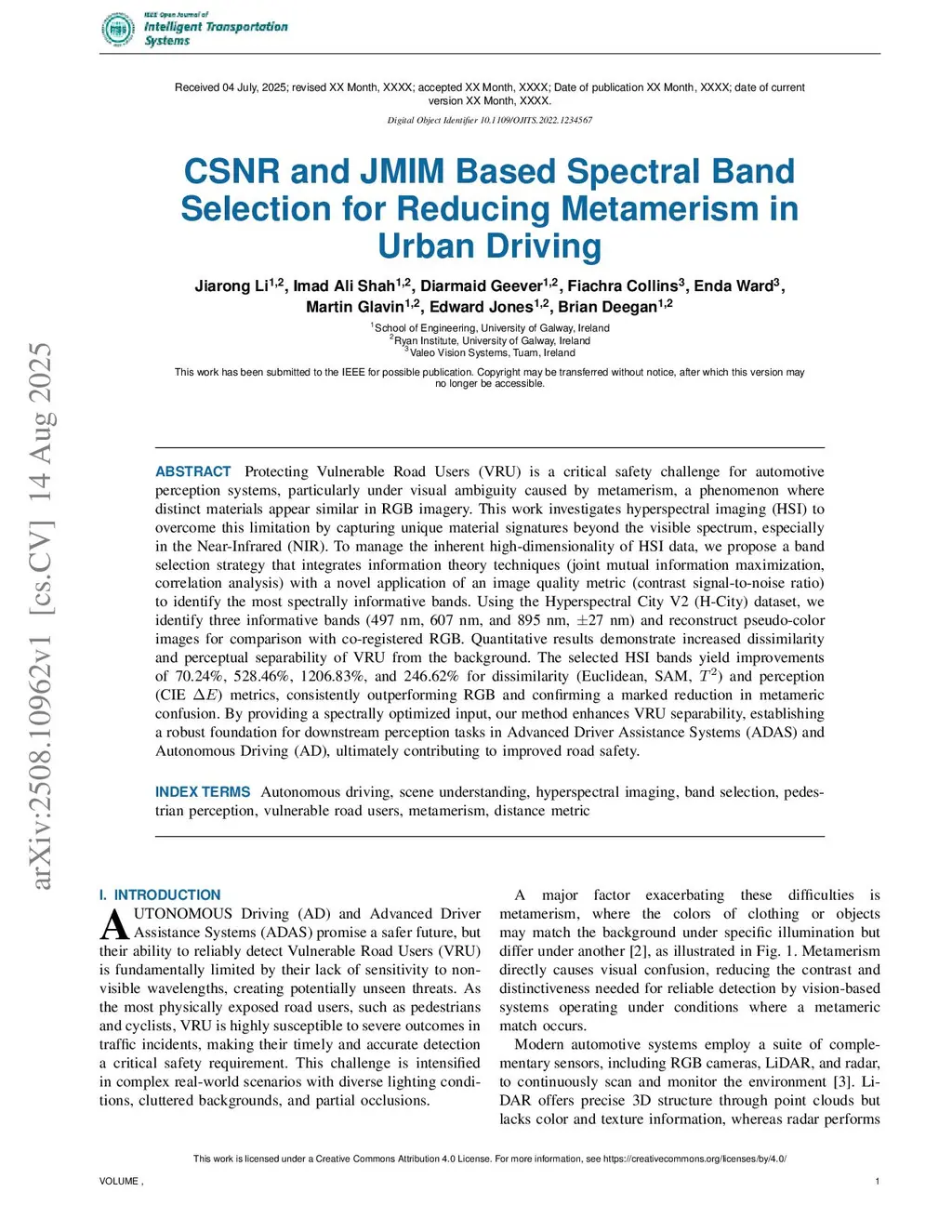 CSNR and JMIM Based Spectral Band Selection for Reducing Metamerism in Urban Driving