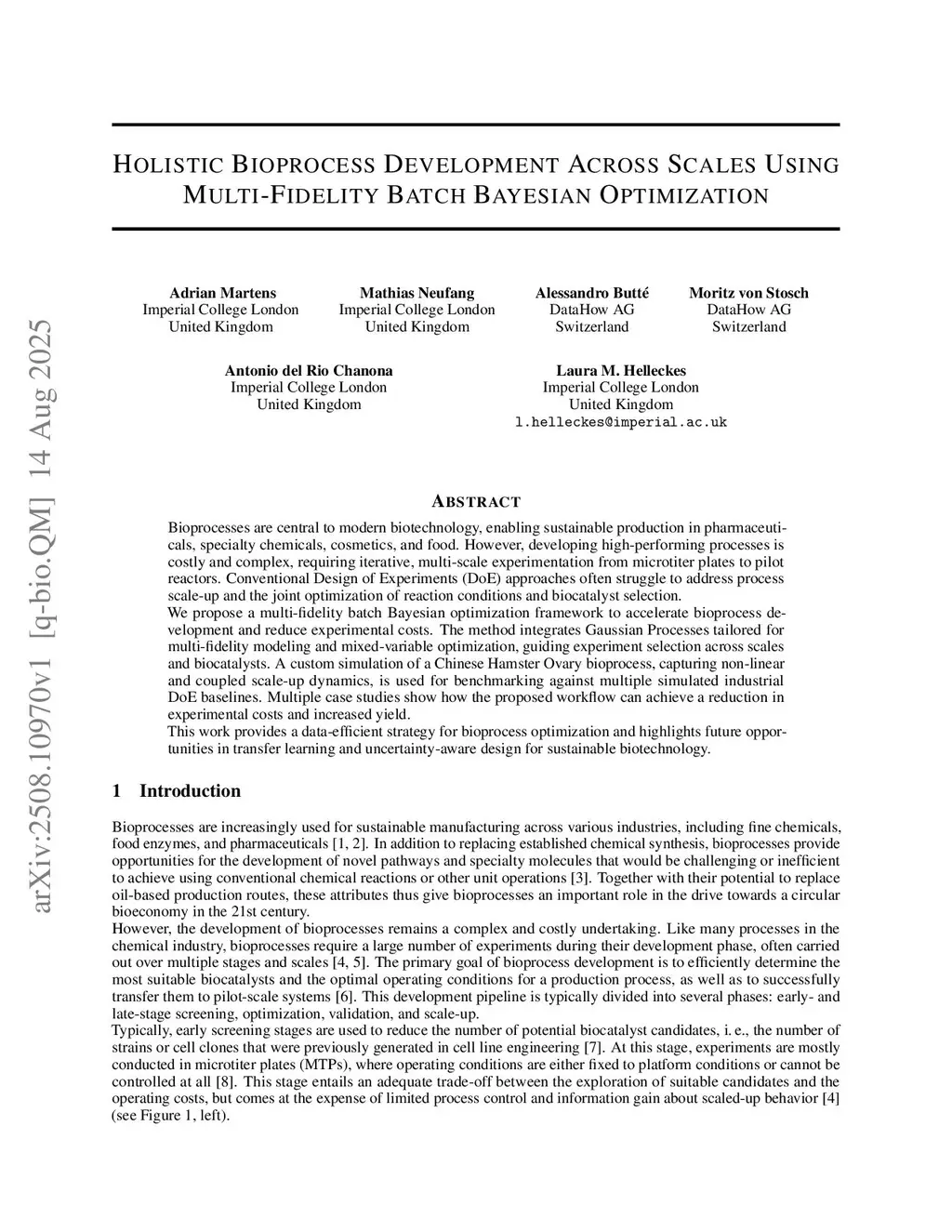 Bioprocesses are central to modern biotechnology, enabling sustainable production in pharmaceuticals, specialty chemicals, cosmetics, and food. However, developing high-performing processes is costly and complex, requiring iterative, multi-scale experimentation from microtiter plates to pilot reactors. Conventional Design of Experiments (DoE) approaches often struggle to address process scale-up and the joint optimization of reaction conditions and biocatalyst selection.We propose a multi-fidelity batch Bayesian optimization framework to accelerate bioprocess development and reduce experimental costs. The method integrates Gaussian Processes tailored for multi-fidelity modeling and mixed-variable optimization, guiding experiment selection across scales and biocatalysts. A custom simulation of a Chinese Hamster Ovary bioprocess, capturing non-linear and coupled scale-up dynamics, is used for benchmarking against multiple simulated industrial DoE baselines. Multiple case studies show how the proposed workflow can achieve a reduction in experimental costs and increased yield.This work provides a data-efficient strategy for bioprocess optimization and highlights future opportunities in transfer learning and uncertainty-aware design for sustainable biotechnology.