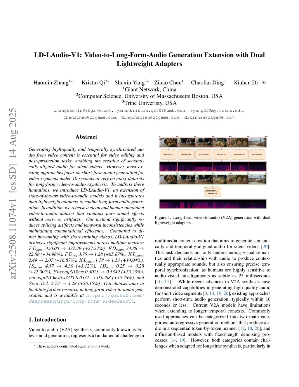 Generating high-quality and temporally synchronized audio from video content is essential for video editing and post-production tasks, enabling the creation of semantically aligned audio for silent videos. However, most existing approaches focus on short-form audio generation for video segments under 10 seconds or rely on noisy datasets for long-form video-to-audio zsynthesis. To address these limitations, we introduce LD-LAudio-V1, an extension of state-of-the-art video-to-audio models and it incorporates dual lightweight adapters to enable long-form audio generation. In addition, we release a clean and human-annotated video-to-audio dataset that contains pure sound effects without noise or artifacts. Our method significantly reduces splicing artifacts and temporal inconsistencies while maintaining computational efficiency. Compared to direct fine-tuning with short training videos, LD-LAudio-V1 achieves significant improvements across multiple metrics: 450.00 327.29 (+27.27%), 34.88 22.68 (+34.98%), 3.75 1.28 (+65.87%), 2.49 2.07 (+16.87%), 1.78 1.53 (+14.04%), 4.17 4.30 (+3.12%), 0.25 0.28 (+12.00%), 0.3013 0.1349 (+55.23%), 0.0531 0.0288 (+45.76%), and 2.73 3.28 (+20.15%). Our dataset aims to facilitate further research in long-form video-to-audio generation and is available atthis https URL.