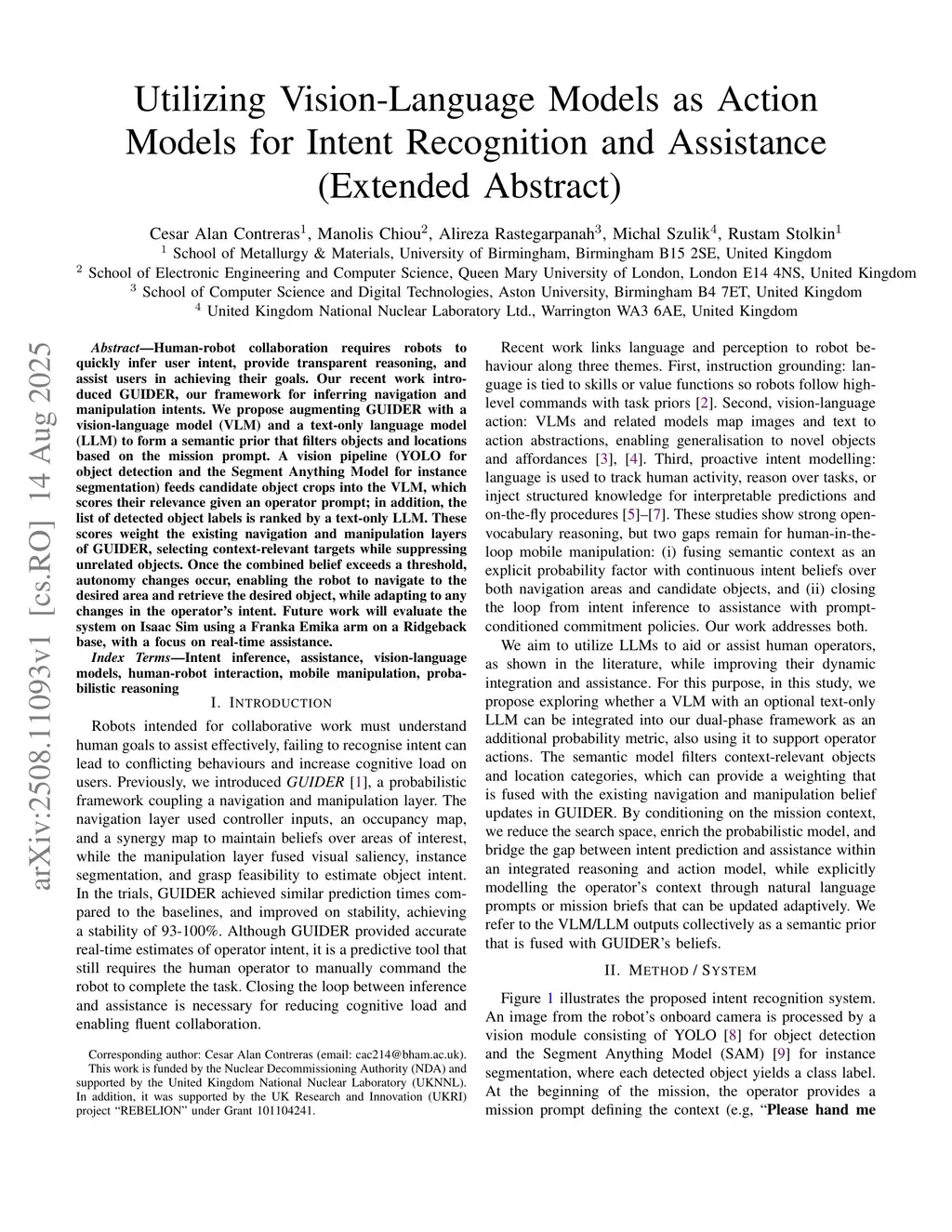 Human-robot collaboration requires robots to quickly infer user intent, provide transparent reasoning, and assist users in achieving their goals. Our recent work introduced GUIDER, our framework for inferring navigation and manipulation intents. We propose augmenting GUIDER with a vision-language model (VLM) and a text-only language model (LLM) to form a semantic prior that filters objects and locations based on the mission prompt. A vision pipeline (YOLO for object detection and the Segment Anything Model for instance segmentation) feeds candidate object crops into the VLM, which scores their relevance given an operator prompt; in addition, the list of detected object labels is ranked by a text-only LLM. These scores weight the existing navigation and manipulation layers of GUIDER, selecting context-relevant targets while suppressing unrelated objects. Once the combined belief exceeds a threshold, autonomy changes occur, enabling the robot to navigate to the desired area and retrieve the desired object, while adapting to any changes in the operator's intent. Future work will evaluate the system on Isaac Sim using a Franka Emika arm on a Ridgeback base, with a focus on real-time assistance.
