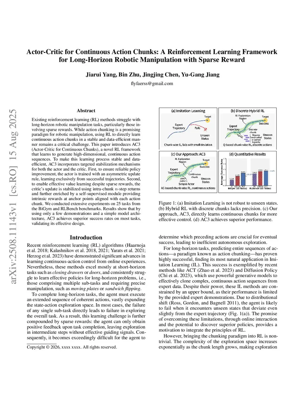 Existing reinforcement learning (RL) methods struggle with long-horizon robotic manipulation tasks, particularly those involving sparse rewards. While action chunking is a promising paradigm for robotic manipulation, using RL to directly learn continuous action chunks in a stable and data-efficient manner remains a critical challenge. This paper introduces AC3 (Actor-Critic for Continuous Chunks), a novel RL framework that learns to generate high-dimensional, continuous action sequences. To make this learning process stable and data-efficient, AC3 incorporates targeted stabilization mechanisms for both the actor and the critic. First, to ensure reliable policy improvement, the actor is trained with an asymmetric update rule, learning exclusively from successful trajectories. Second, to enable effective value learning despite sparse rewards, the critic's update is stabilized using intra-chunk -step returns and further enriched by a self-supervised module providing intrinsic rewards at anchor points aligned with each action chunk. We conducted extensive experiments on 25 tasks from the BiGym and RLBench benchmarks. Results show that by using only a few demonstrations and a simple model architecture, AC3 achieves superior success rates on most tasks, validating its effective design.