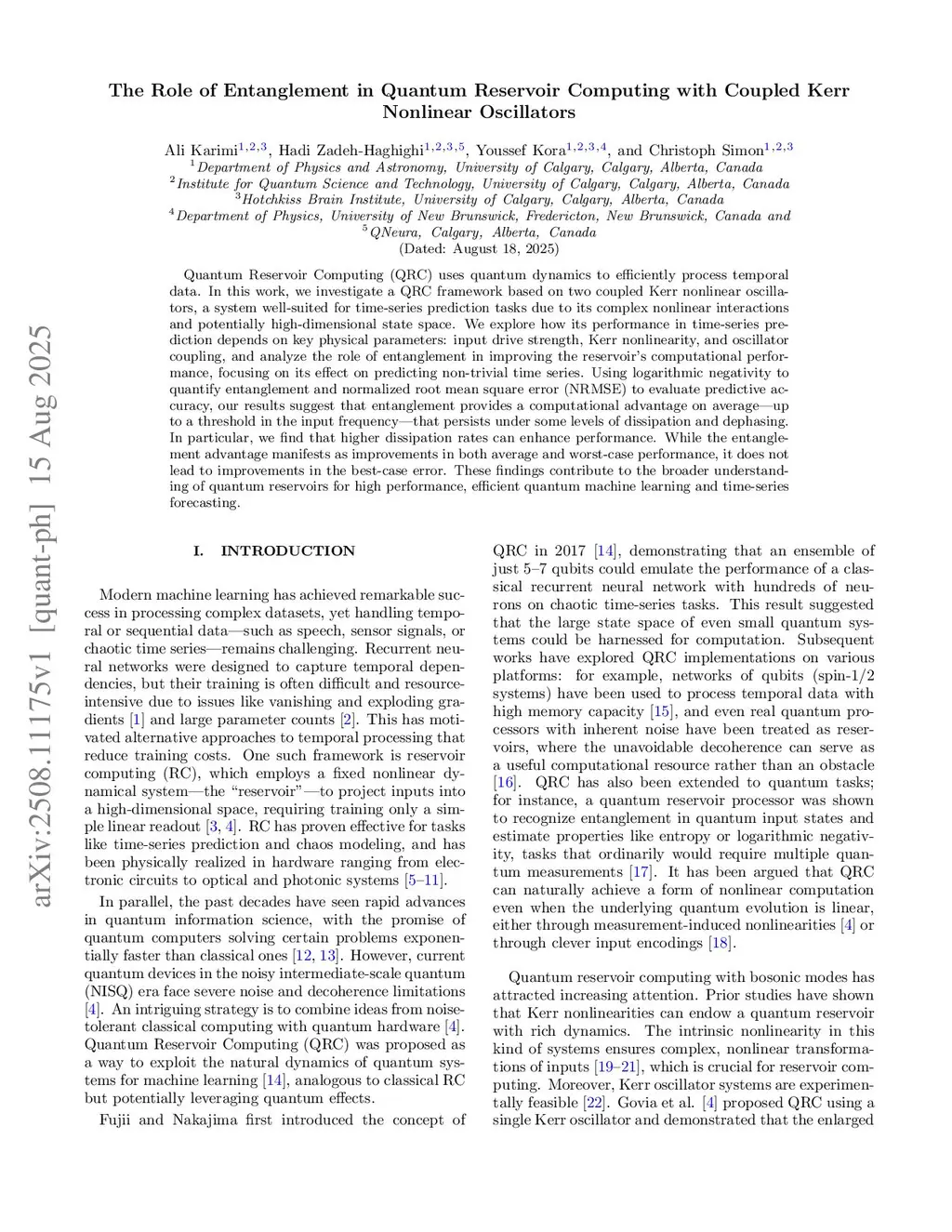 Quantum Reservoir Computing (QRC) uses quantum dynamics to efficiently process temporal data. In this work, we investigate a QRC framework based on two coupled Kerr nonlinear oscillators, a system well-suited for time-series prediction tasks due to its complex nonlinear interactions and potentially high-dimensional state space. We explore how its performance in forecasting both linear and nonlinear time-series depends on key physical parameters: input drive strength, Kerr nonlinearity, and oscillator coupling, and analyze the role of entanglement in improving the reservoir's computational performance, focusing on its effect on predicting non-trivial time series. Using logarithmic negativity to quantify entanglement and normalized root mean square error (NRMSE) to evaluate predictive accuracy, our results suggest that entanglement provides a computational advantage on average -- up to a threshold in the input frequency -- that persists under some levels of dissipation and dephasing. In particular, we find that higher dissipation rates can enhance performance. While the entanglement advantage manifests as improvements in both average and worst-case performance, it does not lead to improvements in the best-case error. These findings contribute to the broader understanding of quantum reservoirs for high performance, efficient quantum machine learning and time-series forecasting.