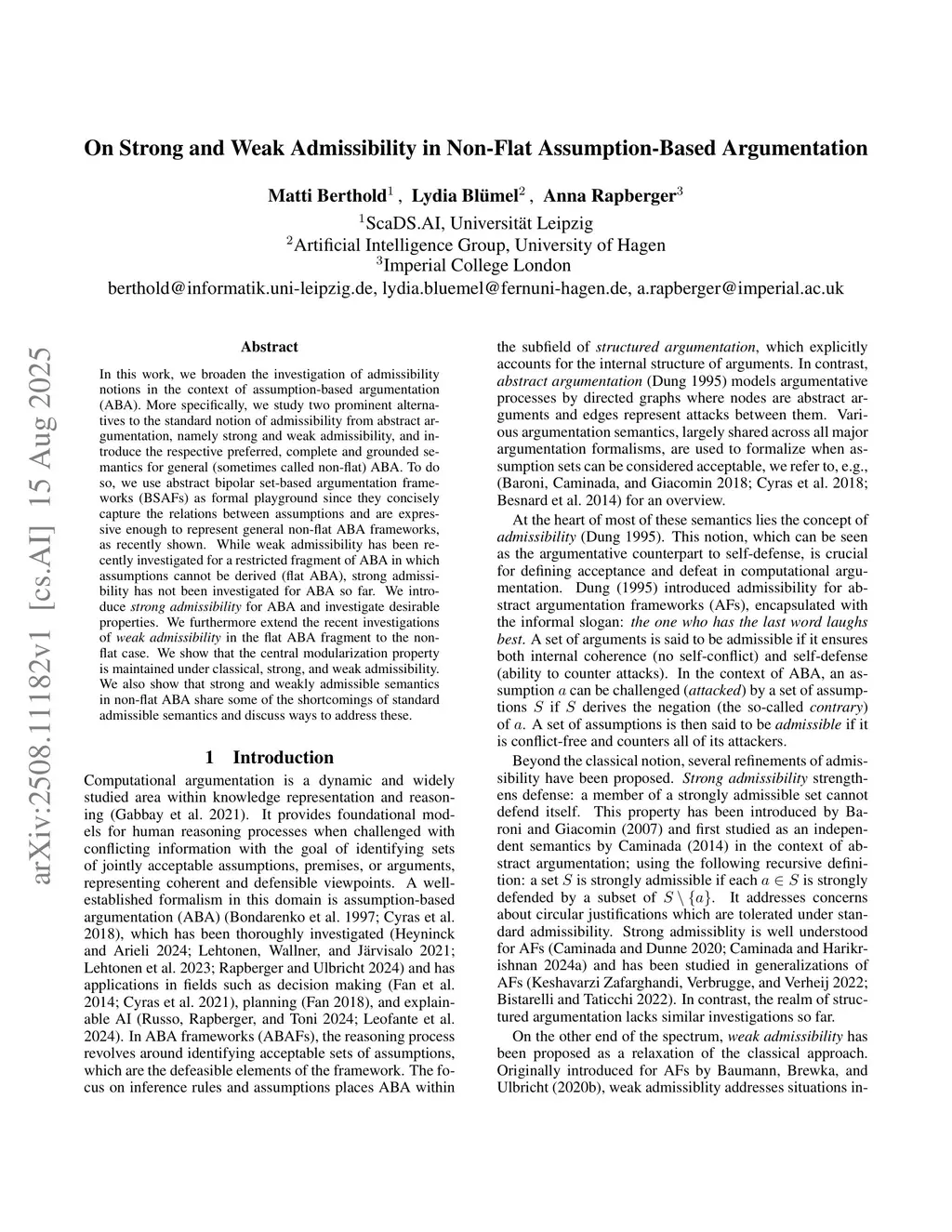 In this work, we broaden the investigation of admissibility notions in the context of assumption-based argumentation (ABA). More specifically, we study two prominent alternatives to the standard notion of admissibility from abstract argumentation, namely strong and weak admissibility, and introduce the respective preferred, complete and grounded semantics for general (sometimes called non-flat) ABA. To do so, we use abstract bipolar set-based argumentation frameworks (BSAFs) as formal playground since they concisely capture the relations between assumptions and are expressive enough to represent general non-flat ABA frameworks, as recently shown. While weak admissibility has been recently investigated for a restricted fragment of ABA in which assumptions cannot be derived (flat ABA), strong admissibility has not been investigated for ABA so far. We introduce strong admissibility for ABA and investigate desirable properties. We furthermore extend the recent investigations of weak admissibility in the flat ABA fragment to the non-flat case. We show that the central modularization property is maintained under classical, strong, and weak admissibility. We also show that strong and weakly admissible semantics in non-flat ABA share some of the shortcomings of standard admissible semantics and discuss ways to address these.