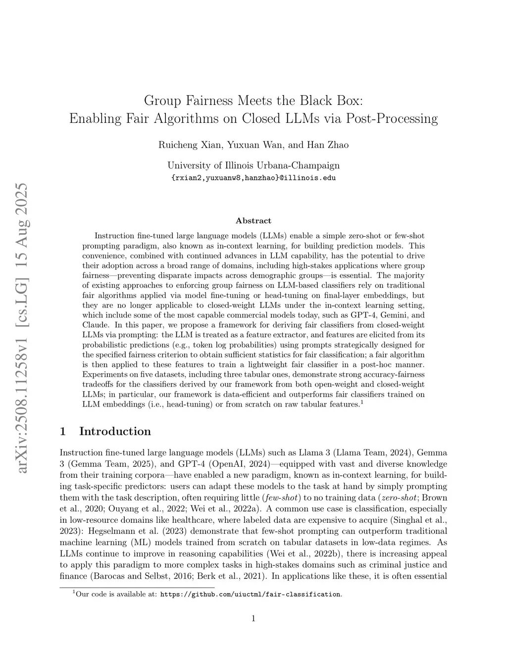 Instruction fine-tuned large language models (LLMs) enable a simple zero-shot or few-shot prompting paradigm, also known as in-context learning, for building prediction models. This convenience, combined with continued advances in LLM capability, has the potential to drive their adoption across a broad range of domains, including high-stakes applications where group fairness -- preventing disparate impacts across demographic groups -- is essential. The majority of existing approaches to enforcing group fairness on LLM-based classifiers rely on traditional fair algorithms applied via model fine-tuning or head-tuning on final-layer embeddings, but they are no longer applicable to closed-weight LLMs under the in-context learning setting, which include some of the most capable commercial models today, such as GPT-4, Gemini, and Claude. In this paper, we propose a framework for deriving fair classifiers from closed-weight LLMs via prompting: the LLM is treated as a feature extractor, and features are elicited from its probabilistic predictions (e.g., token log probabilities) using prompts strategically designed for the specified fairness criterion to obtain sufficient statistics for fair classification; a fair algorithm is then applied to these features to train a lightweight fair classifier in a post-hoc manner. Experiments on five datasets, including three tabular ones, demonstrate strong accuracy-fairness tradeoffs for the classifiers derived by our framework from both open-weight and closed-weight LLMs; in particular, our framework is data-efficient and outperforms fair classifiers trained on LLM embeddings (i.e., head-tuning) or from scratch on raw tabular features.