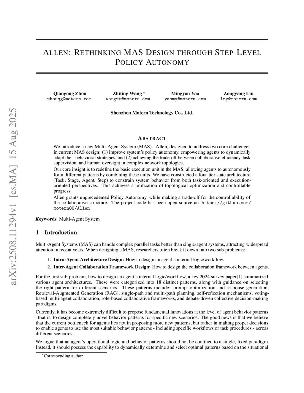 We introduce a new Multi-Agent System (MAS) - Allen, designed to address two core challenges in current MAS design: (1) improve system's policy autonomy, empowering agents to dynamically adapt their behavioral strategies, and (2) achieving the trade-off between collaborative efficiency, task supervision, and human oversight in complex network topologies.Our core insight is to redefine the basic execution unit in the MAS, allowing agents to autonomously form different patterns by combining these units. We have constructed a four-tier state architecture (Task, Stage, Agent, Step) to constrain system behavior from both task-oriented and execution-oriented perspectives. This achieves a unification of topological optimization and controllable progress.Allen grants unprecedented Policy Autonomy, while making a trade-off for the controllability of the collaborative structure. The project code has been open source at:this https URL