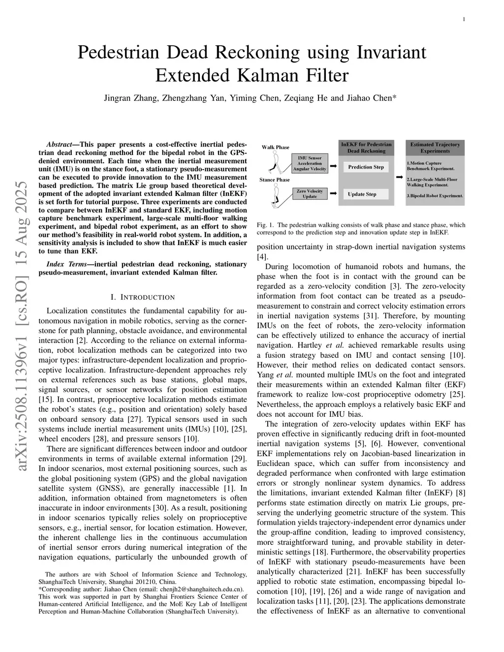 This paper presents a cost-effective inertial pedestrian dead reckoning method for the bipedal robot in the GPS-denied environment. Each time when the inertial measurement unit (IMU) is on the stance foot, a stationary pseudo-measurement can be executed to provide innovation to the IMU measurement based prediction. The matrix Lie group based theoretical development of the adopted invariant extended Kalman filter (InEKF) is set forth for tutorial purpose. Three experiments are conducted to compare between InEKF and standard EKF, including motion capture benchmark experiment, large-scale multi-floor walking experiment, and bipedal robot experiment, as an effort to show our method's feasibility in real-world robot system. In addition, a sensitivity analysis is included to show that InEKF is much easier to tune than EKF.