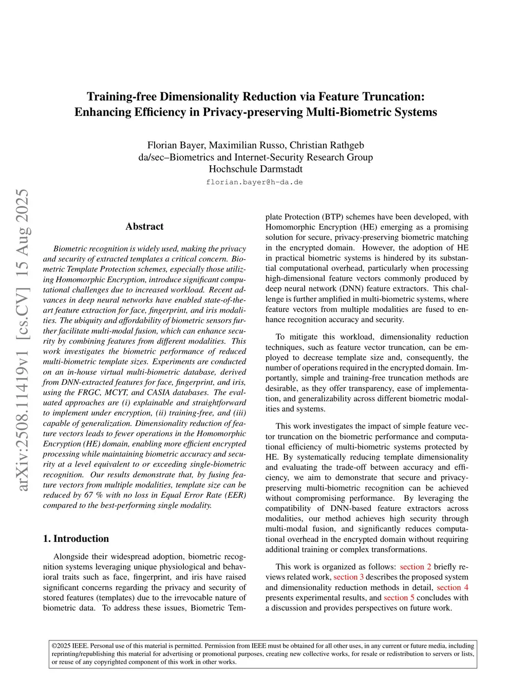 Training-free Dimensionality Reduction via Feature Truncation: Enhancing Efficiency in Privacy-preserving Multi-Biometric Systems