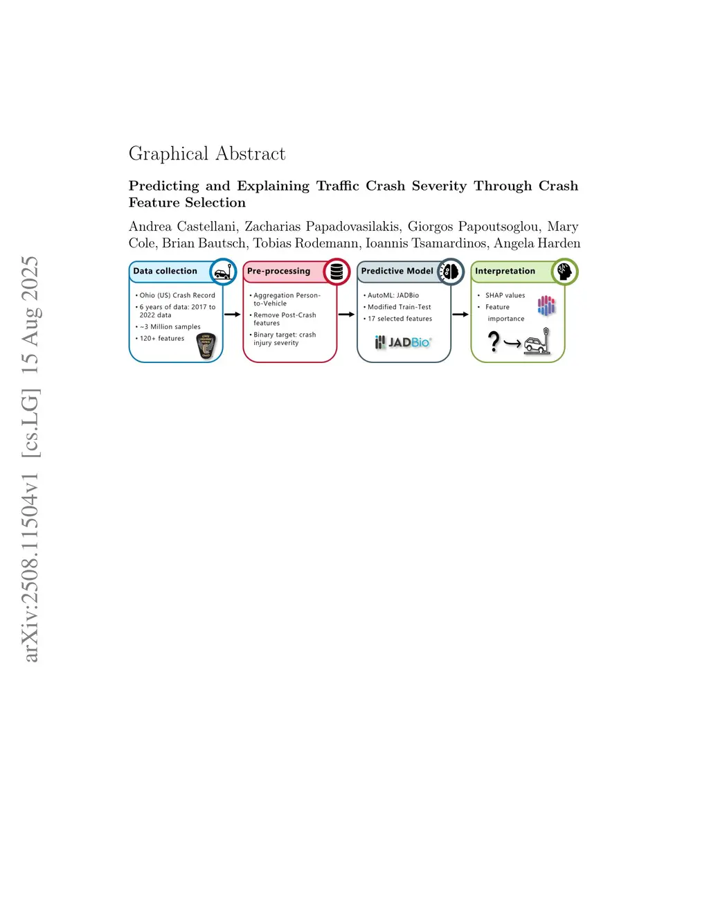 Motor vehicle crashes remain a leading cause of injury and death worldwide, necessitating data-driven approaches to understand and mitigate crash severity. This study introduces a curated dataset of more than 3 million people involved in accidents in Ohio over six years (2017-2022), aggregated to more than 2.3 million vehicle-level records for predictive analysis. The primary contribution is a transparent and reproducible methodology that combines Automated Machine Learning (AutoML) and explainable artificial intelligence (AI) to identify and interpret key risk factors associated with severe crashes. Using the JADBio AutoML platform, predictive models were constructed to distinguish between severe and non-severe crash outcomes. The models underwent rigorous feature selection across stratified training subsets, and their outputs were interpreted using SHapley Additive exPlanations (SHAP) to quantify the contribution of individual features. A final Ridge Logistic Regression model achieved an AUC-ROC of 85.6% on the training set and 84.9% on a hold-out test set, with 17 features consistently identified as the most influential predictors. Key features spanned demographic, environmental, vehicle, human, and operational categories, including location type, posted speed, minimum occupant age, and pre-crash action. Notably, certain traditionally emphasized factors, such as alcohol or drug impairment, were less influential in the final model compared to environmental and contextual variables. Emphasizing methodological rigor and interpretability over mere predictive performance, this study offers a scalable framework to support Vision Zero with aligned interventions and advanced data-informed traffic safety policy.