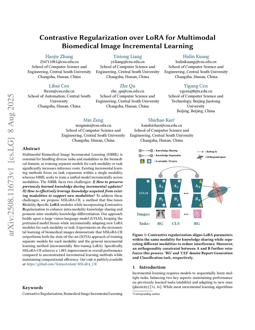 Contrastive Regularization over LoRA for Multimodal Biomedical Image Incremental Learning