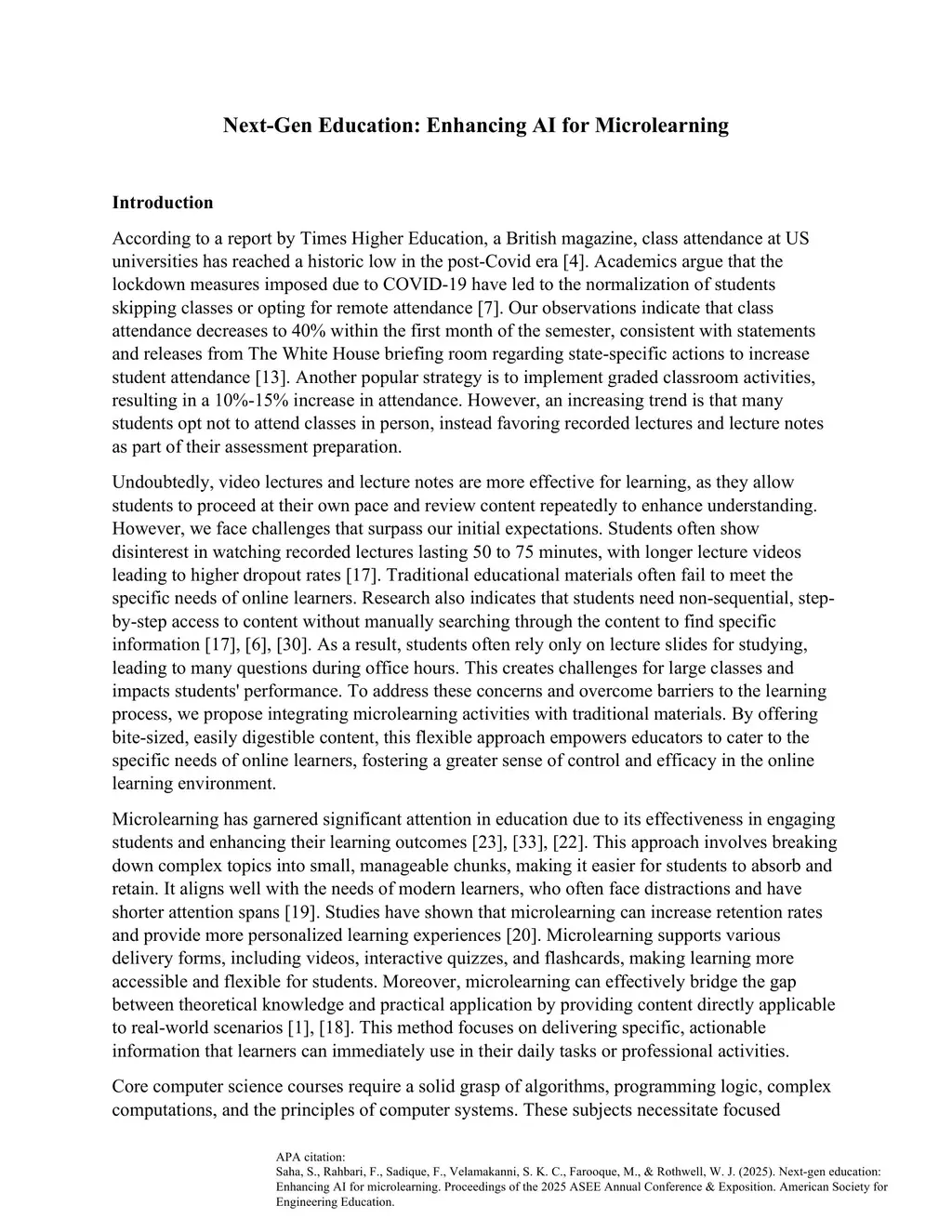 This paper explores integrating microlearning strategies into university curricula, particularly in computer science education, to counteract the decline in class attendance and engagement in US universities after COVID. As students increasingly opt for remote learning and recorded lectures, traditional educational approaches struggle to maintain engagement and effectiveness. Microlearning, which breaks complex subjects into manageable units, is proposed to address shorter attention spans and enhance educational outcomes. It uses interactive formats such as videos, quizzes, flashcards, and scenario-based exercises, which are especially beneficial for topics like algorithms and programming logic requiring deep understanding and ongoing practice. Adoption of microlearning is often limited by the effort needed to create such materials. This paper proposes leveraging AI tools, specifically ChatGPT, to reduce the workload for educators by automating the creation of supplementary materials. While AI can automate certain tasks, educators remain essential in guiding and shaping the learning process. This AI-enhanced approach ensures course content is kept current with the latest research and technology, with educators providing context and insights. By examining AI capabilities in microlearning, this study shows the potential to transform educational practices and outcomes in computer science, offering a practical model for combining advanced technology with established teaching methods.
