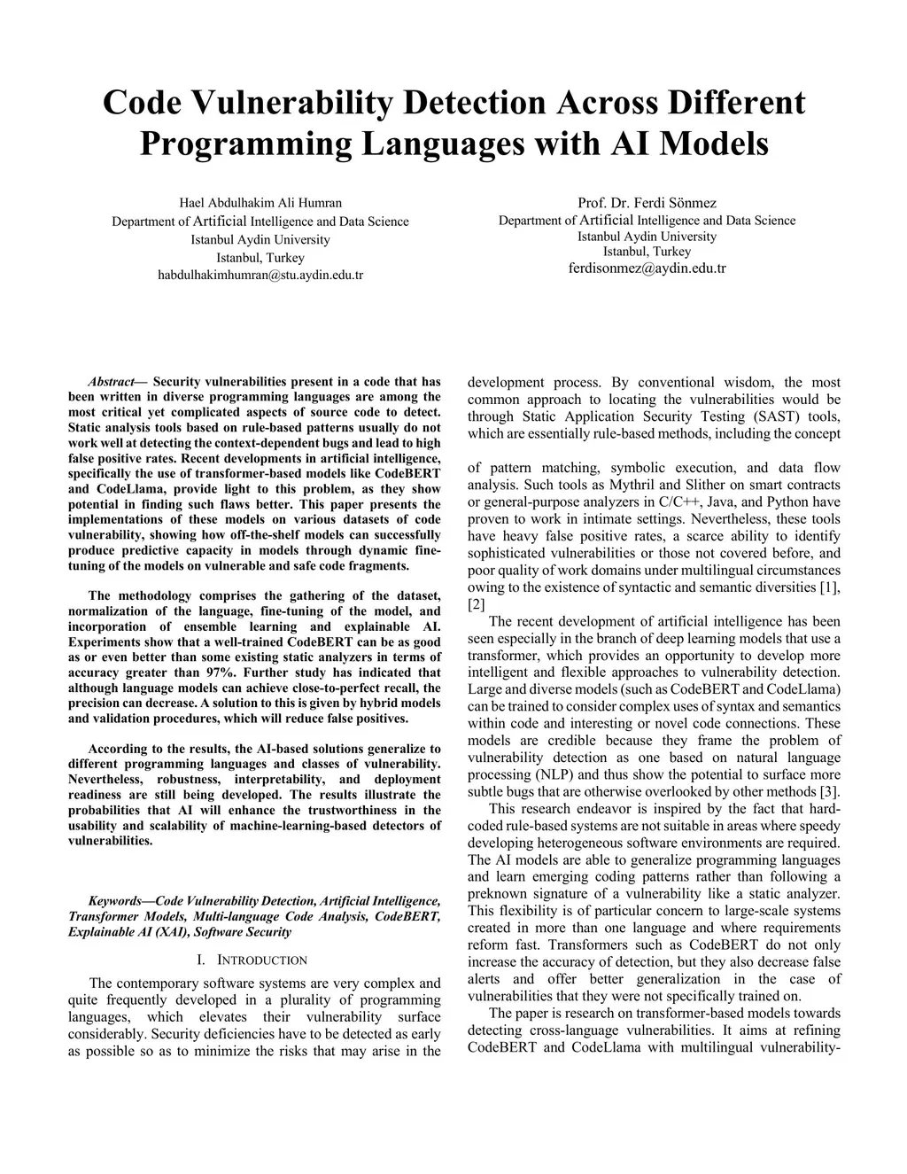 Security vulnerabilities present in a code that has been written in diverse programming languages are among the most critical yet complicated aspects of source code to detect. Static analysis tools based on rule-based patterns usually do not work well at detecting the context-dependent bugs and lead to high false positive rates. Recent developments in artificial intelligence, specifically the use of transformer-based models like CodeBERT and CodeLlama, provide light to this problem, as they show potential in finding such flaws better. This paper presents the implementations of these models on various datasets of code vulnerability, showing how off-the-shelf models can successfully produce predictive capacity in models through dynamic fine-tuning of the models on vulnerable and safe code fragments. The methodology comprises the gathering of the dataset, normalization of the language, fine-tuning of the model, and incorporation of ensemble learning and explainable AI. Experiments show that a well-trained CodeBERT can be as good as or even better than some existing static analyzers in terms of accuracy greater than 97%. Further study has indicated that although language models can achieve close-to-perfect recall, the precision can decrease. A solution to this is given by hybrid models and validation procedures, which will reduce false positives. According to the results, the AI-based solutions generalize to different programming languages and classes of vulnerability. Nevertheless, robustness, interpretability, and deployment readiness are still being developed. The results illustrate the probabilities that AI will enhance the trustworthiness in the usability and scalability of machine-learning-based detectors of vulnerabilities.