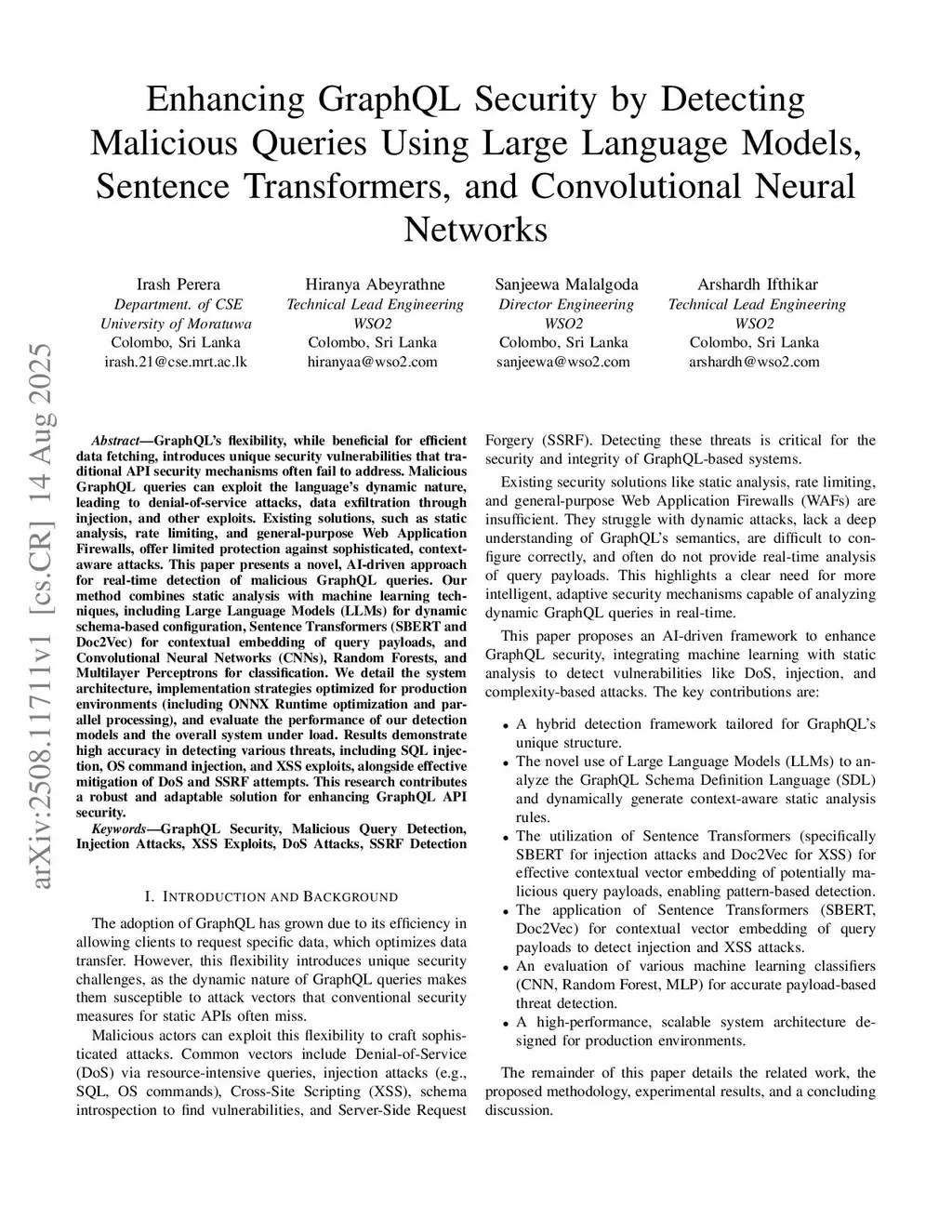 Enhancing GraphQL Security by Detecting Malicious Queries Using Large Language Models, Sentence Transformers, and Convolutional Neural Networks