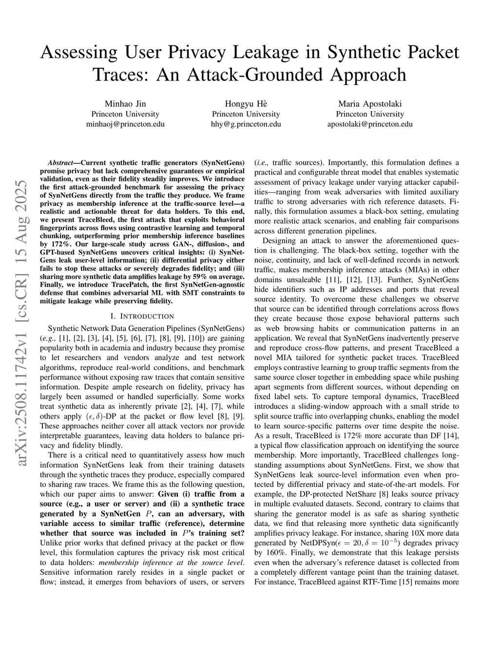 Current synthetic traffic generators (SynNetGens) promise privacy but lack comprehensive guarantees or empirical validation, even as their fidelity steadily improves. We introduce the first attack-grounded benchmark for assessing the privacy of SynNetGens directly from the traffic they produce. We frame privacy as membership inference at the traffic-source level--a realistic and actionable threat for data holders. To this end, we present TraceBleed, the first attack that exploits behavioral fingerprints across flows using contrastive learning and temporal chunking, outperforming prior membership inference baselines by 172%. Our large-scale study across GAN-, diffusion-, and GPT-based SynNetGens uncovers critical insights: (i) SynNetGens leak user-level information; (ii) differential privacy either fails to stop these attacks or severely degrades fidelity; and (iii) sharing more synthetic data amplifies leakage by 59% on average. Finally, we introduce TracePatch, the first SynNetGen-agnostic defense that combines adversarial ML with SMT constraints to mitigate leakage while preserving fidelity.