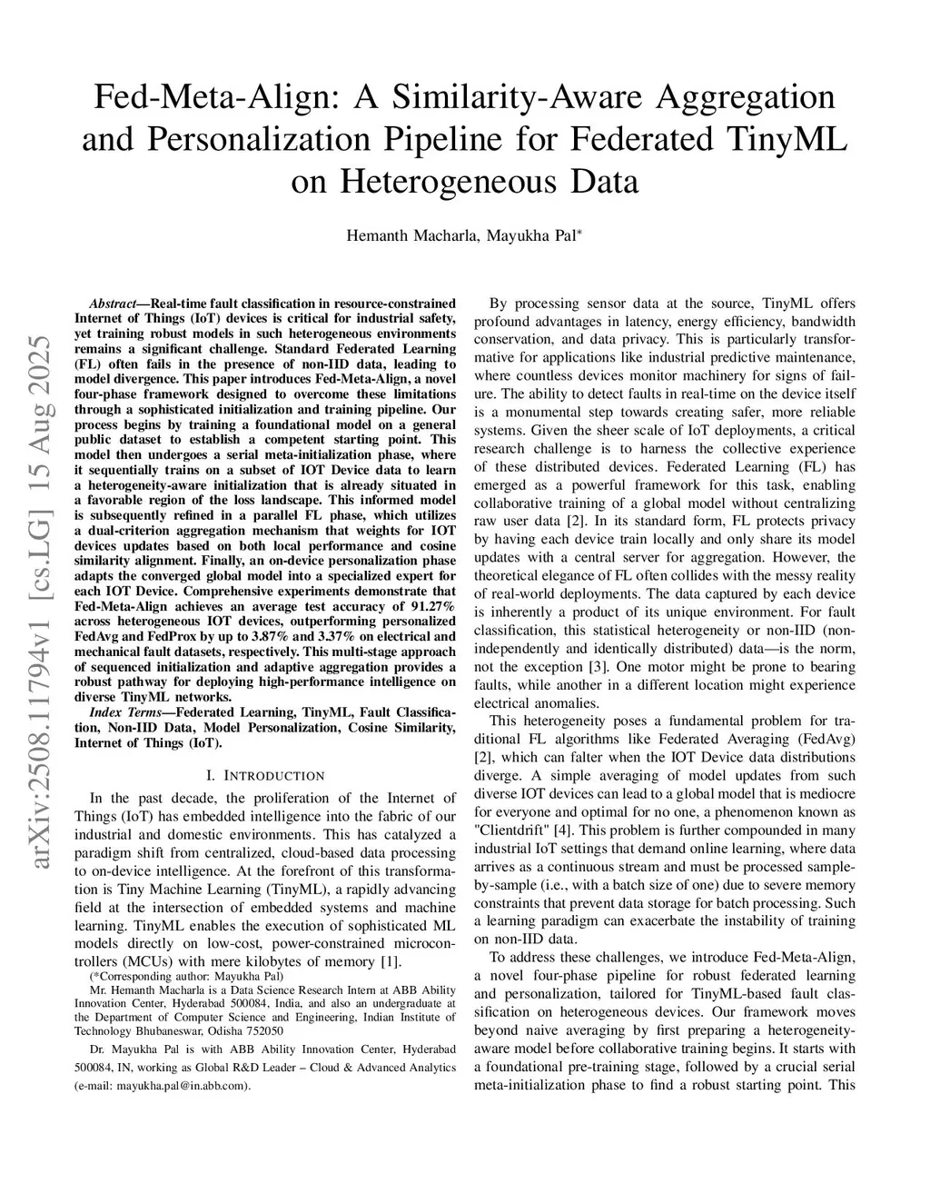 Real-time fault classification in resource-constrained Internet of Things (IoT) devices is critical for industrial safety, yet training robust models in such heterogeneous environments remains a significant challenge. Standard Federated Learning (FL) often fails in the presence of non-IID data, leading to model divergence. This paper introduces Fed-Meta-Align, a novel four-phase framework designed to overcome these limitations through a sophisticated initialization and training pipeline. Our process begins by training a foundational model on a general public dataset to establish a competent starting point. This model then undergoes a serial meta-initialization phase, where it sequentially trains on a subset of IOT Device data to learn a heterogeneity-aware initialization that is already situated in a favorable region of the loss landscape. This informed model is subsequently refined in a parallel FL phase, which utilizes a dual-criterion aggregation mechanism that weights for IOT devices updates based on both local performance and cosine similarity alignment. Finally, an on-device personalization phase adapts the converged global model into a specialized expert for each IOT Device. Comprehensive experiments demonstrate that Fed-Meta-Align achieves an average test accuracy of 91.27% across heterogeneous IOT devices, outperforming personalized FedAvg and FedProx by up to 3.87% and 3.37% on electrical and mechanical fault datasets, respectively. This multi-stage approach of sequenced initialization and adaptive aggregation provides a robust pathway for deploying high-performance intelligence on diverse TinyML networks.