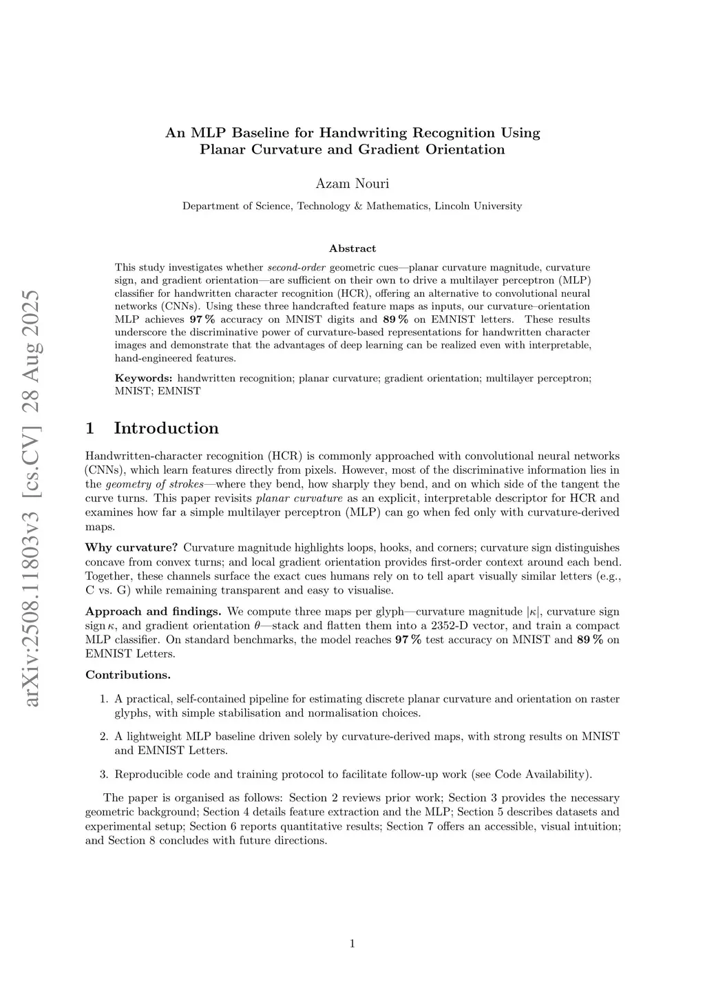 This study investigates whether second-order geometric cues - planar curvature magnitude, curvature sign, and gradient orientation - are sufficient on their own to drive a multilayer perceptron (MLP) classifier for handwritten character recognition (HCR), offering an alternative to convolutional neural networks (CNNs). Using these three handcrafted feature maps as inputs, our curvature-orientation MLP achieves 97 percent accuracy on MNIST digits and 89 percent on EMNIST letters. These results underscore the discriminative power of curvature-based representations for handwritten character images and demonstrate that the advantages of deep learning can be realized even with interpretable, hand-engineered features.