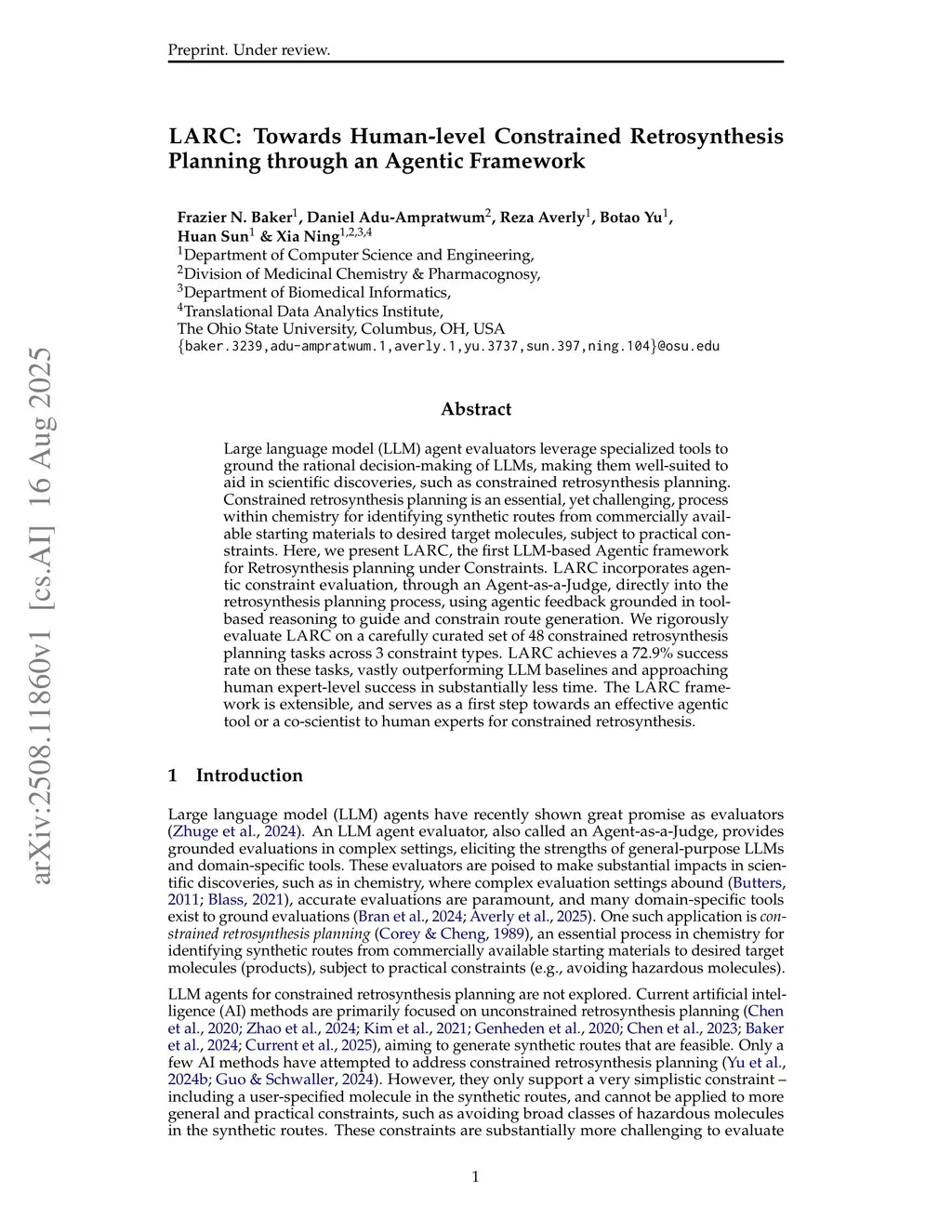 Large language model (LLM) agent evaluators leverage specialized tools to ground the rational decision-making of LLMs, making them well-suited to aid in scientific discoveries, such as constrained retrosynthesis planning. Constrained retrosynthesis planning is an essential, yet challenging, process within chemistry for identifying synthetic routes from commercially available starting materials to desired target molecules, subject to practical constraints. Here, we present LARC, the first LLM-based Agentic framework for Retrosynthesis planning under Constraints. LARC incorporates agentic constraint evaluation, through an Agent-as-a-Judge, directly into the retrosynthesis planning process, using agentic feedback grounded in tool-based reasoning to guide and constrain route generation. We rigorously evaluate LARC on a carefully curated set of 48 constrained retrosynthesis planning tasks across 3 constraint types. LARC achieves a 72.9% success rate on these tasks, vastly outperforming LLM baselines and approaching human expert-level success in substantially less time. The LARC framework is extensible, and serves as a first step towards an effective agentic tool or a co-scientist to human experts for constrained retrosynthesis.