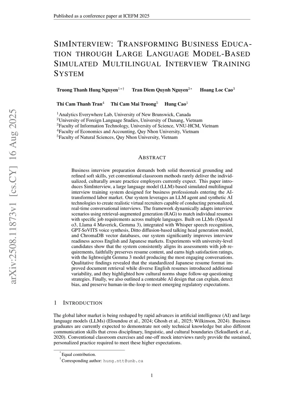Business interview preparation demands both solid theoretical grounding and refined soft skills, yet conventional classroom methods rarely deliver the individualized, culturally aware practice employers currently expect. This paper introduces SimInterview, a large language model (LLM)-based simulated multilingual interview training system designed for business professionals entering the AI-transformed labor market. Our system leverages an LLM agent and synthetic AI technologies to create realistic virtual recruiters capable of conducting personalized, real-time conversational interviews. The framework dynamically adapts interview scenarios using retrieval-augmented generation (RAG) to match individual resumes with specific job requirements across multiple languages. Built on LLMs (OpenAI o3, Llama 4 Maverick, Gemma 3), integrated with Whisper speech recognition, GPT-SoVITS voice synthesis, Ditto diffusion-based talking head generation model, and ChromaDB vector databases, our system significantly improves interview readiness across English and Japanese markets. Experiments with university-level candidates show that the system consistently aligns its assessments with job requirements, faithfully preserves resume content, and earns high satisfaction ratings, with the lightweight Gemma 3 model producing the most engaging conversations. Qualitative findings revealed that the standardized Japanese resume format improved document retrieval while diverse English resumes introduced additional variability, and they highlighted how cultural norms shape follow-up questioning strategies. Finally, we also outlined a contestable AI design that can explain, detect bias, and preserve human-in-the-loop to meet emerging regulatory expectations.