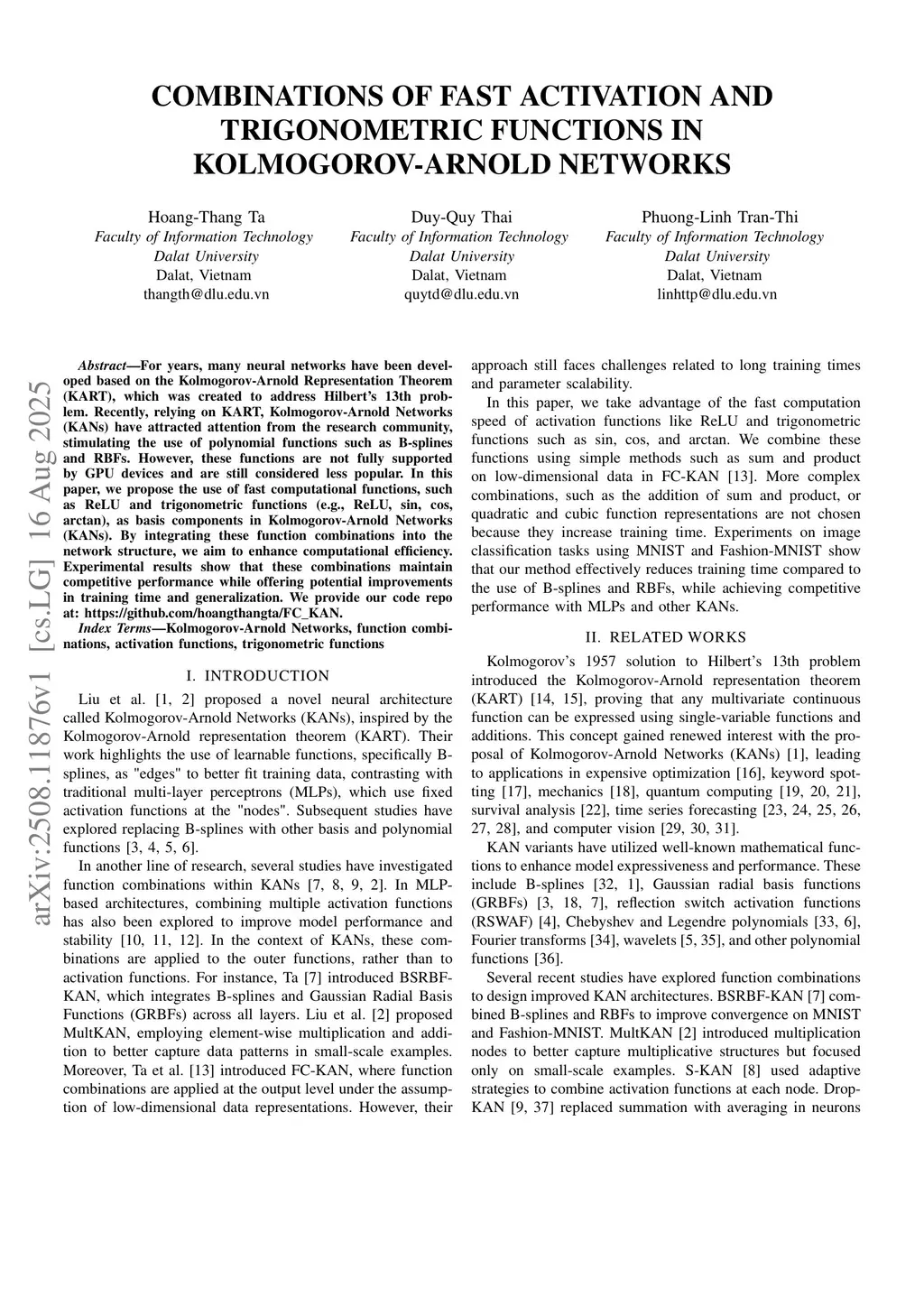 For years, many neural networks have been developed based on the Kolmogorov-Arnold Representation Theorem (KART), which was created to address Hilbert's 13th problem. Recently, relying on KART, Kolmogorov-Arnold Networks (KANs) have attracted attention from the research community, stimulating the use of polynomial functions such as B-splines and RBFs. However, these functions are not fully supported by GPU devices and are still considered less popular. In this paper, we propose the use of fast computational functions, such as ReLU and trigonometric functions (e.g., ReLU, sin, cos, arctan), as basis components in Kolmogorov-Arnold Networks (KANs). By integrating these function combinations into the network structure, we aim to enhance computational efficiency. Experimental results show that these combinations maintain competitive performance while offering potential improvements in training time and generalization.