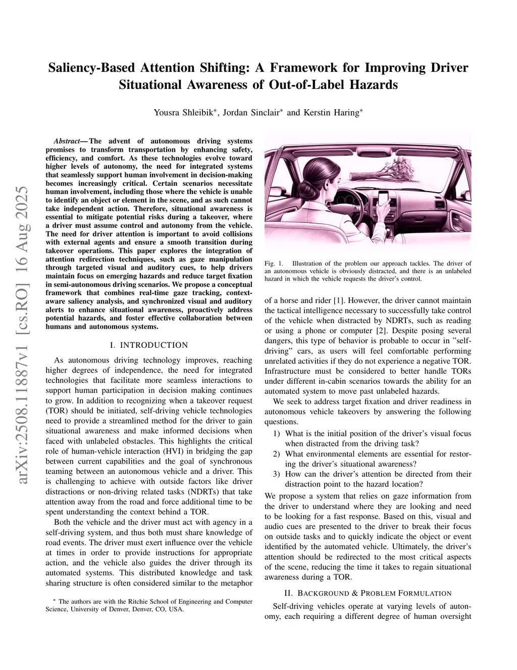 The advent of autonomous driving systems promises to transform transportation by enhancing safety, efficiency, and comfort. As these technologies evolve toward higher levels of autonomy, the need for integrated systems that seamlessly support human involvement in decision-making becomes increasingly critical. Certain scenarios necessitate human involvement, including those where the vehicle is unable to identify an object or element in the scene, and as such cannot take independent action. Therefore, situational awareness is essential to mitigate potential risks during a takeover, where a driver must assume control and autonomy from the vehicle. The need for driver attention is important to avoid collisions with external agents and ensure a smooth transition during takeover operations. This paper explores the integration of attention redirection techniques, such as gaze manipulation through targeted visual and auditory cues, to help drivers maintain focus on emerging hazards and reduce target fixation in semi-autonomous driving scenarios. We propose a conceptual framework that combines real-time gaze tracking, context-aware saliency analysis, and synchronized visual and auditory alerts to enhance situational awareness, proactively address potential hazards, and foster effective collaboration between humans and autonomous systems.