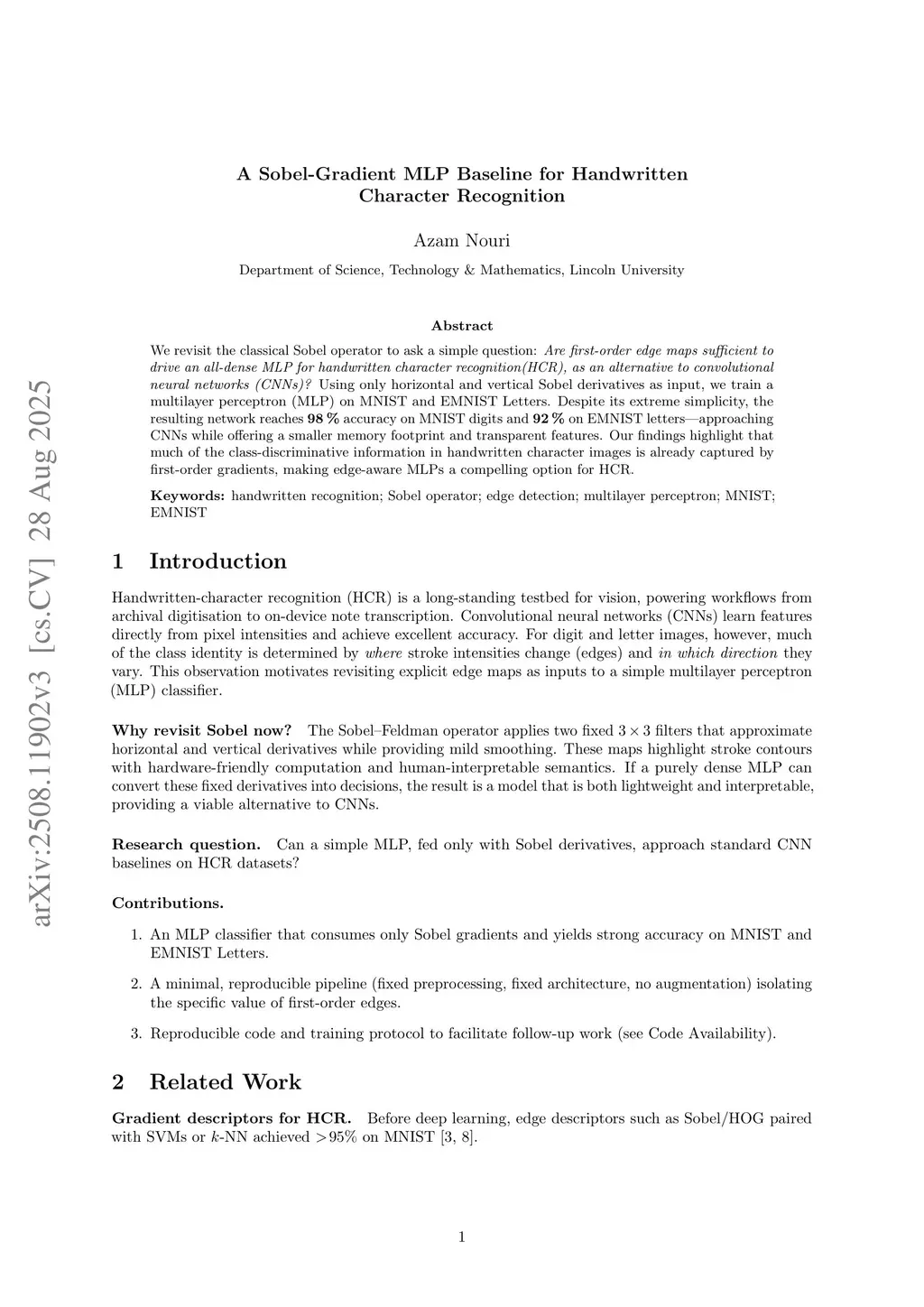 We revisit the classical Sobel operator to ask a simple question: Are first-order edge maps sufficient to drive an all-dense multilayer perceptron (MLP) for handwritten character recognition (HCR), as an alternative to convolutional neural networks (CNNs)? Using only horizontal and vertical Sobel derivatives as input, we train an MLP on MNIST and EMNIST Letters. Despite its extreme simplicity, the resulting network reaches 98% accuracy on MNIST digits and 92% on EMNIST letters -- approaching CNNs while offering a smaller memory footprint and transparent features. Our findings highlight that much of the class-discriminative information in handwritten character images is already captured by first-order gradients, making edge-aware MLPs a compelling option for HCR.