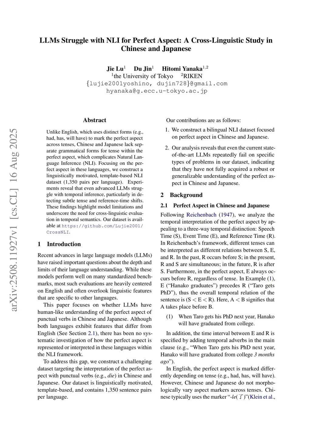 Unlike English, which uses distinct forms (e.g., had, has, will have) to mark the perfect aspect across tenses, Chinese and Japanese lack separate grammatical forms for tense within the perfect aspect, which complicates Natural Language Inference (NLI). Focusing on the perfect aspect in these languages, we construct a linguistically motivated, template-based NLI dataset (1,350 pairs per language). Experiments reveal that even advanced LLMs struggle with temporal inference, particularly in detecting subtle tense and reference-time shifts. These findings highlight model limitations and underscore the need for cross-linguistic evaluation in temporal semantics. Our dataset is available atthis https URL.