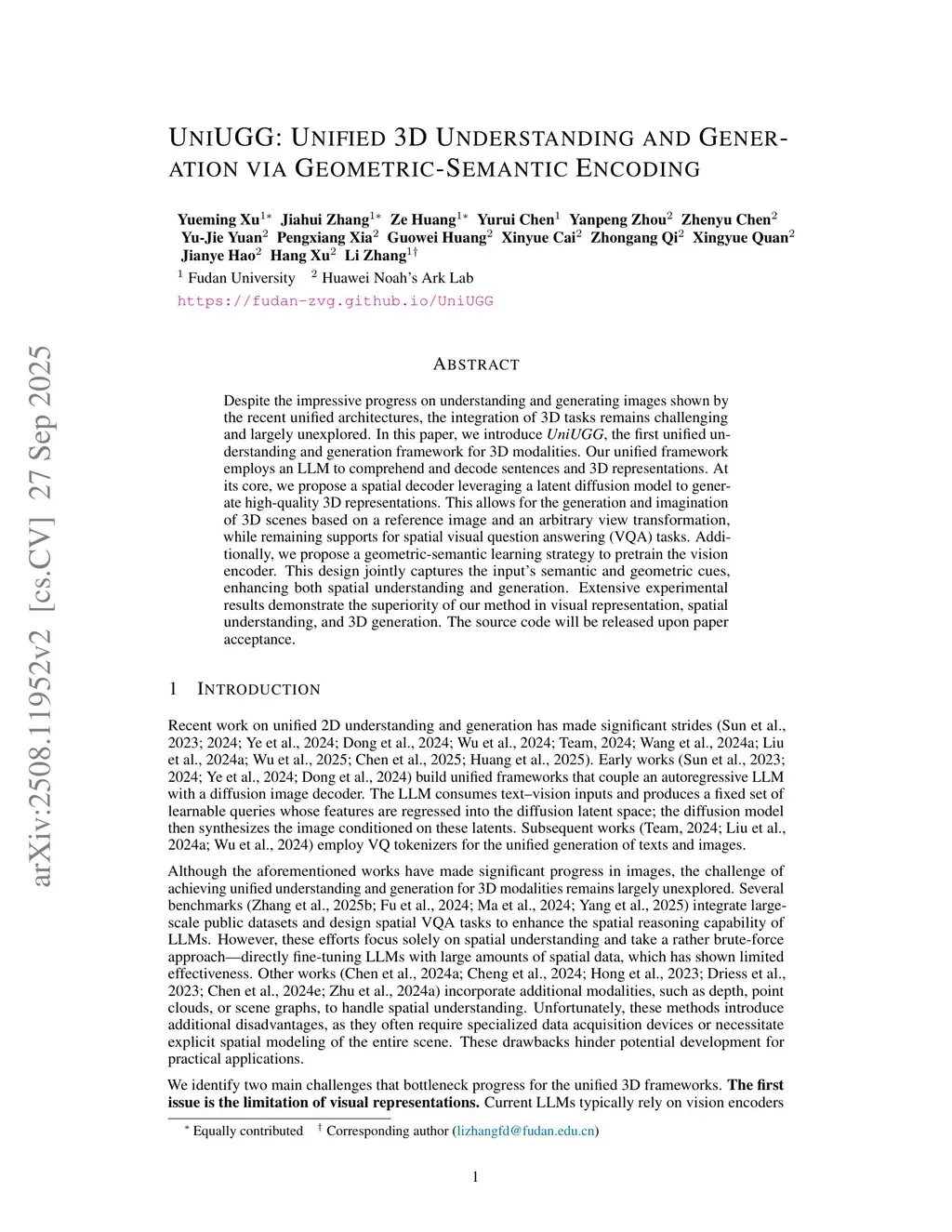 Despite the impressive progress on understanding and generating images shown by the recent unified architectures, the integration of 3D tasks remains challenging and largely unexplored. In this paper, we introduce UniUGG, the first unified understanding and generation framework for 3D modalities. Our unified framework employs an LLM to comprehend and decode sentences and 3D representations. At its core, we propose a spatial decoder leveraging a latent diffusion model to generate high-quality 3D representations. This allows for the generation and imagination of 3D scenes based on a reference image and an arbitrary view transformation, while remaining supports for spatial visual question answering (VQA) tasks. Additionally, we propose a geometric-semantic learning strategy to pretrain the vision encoder. This design jointly captures the input's semantic and geometric cues, enhancing both spatial understanding and generation. Extensive experimental results demonstrate the superiority of our method in visual representation, spatial understanding, and 3D generation.