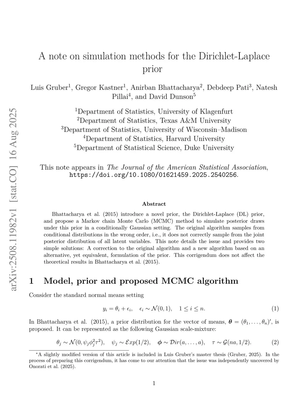 Bhattacharya et al. (2015, Journal of the American Statistical Association 110(512): 1479-1490) introduce a novel prior, the Dirichlet-Laplace (DL) prior, and propose a Markov chain Monte Carlo (MCMC) method to simulate posterior draws under this prior in a conditionally Gaussian setting. The original algorithm samples from conditional distributions in the wrong order, i.e., it does not correctly sample from the joint posterior distribution of all latent variables. This note details the issue and provides two simple solutions: A correction to the original algorithm and a new algorithm based on an alternative, yet equivalent, formulation of the prior. This corrigendum does not affect the theoretical results in Bhattacharya et al. (2015).