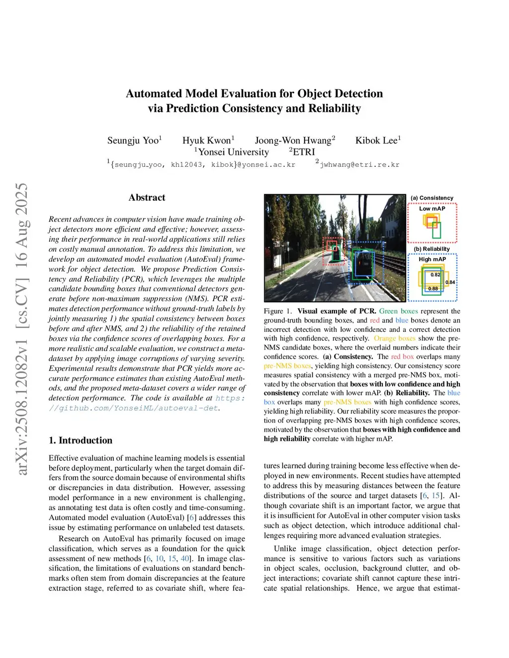 Recent advances in computer vision have made training object detectors more efficient and effective; however, assessing their performance in real-world applications still relies on costly manual annotation. To address this limitation, we develop an automated model evaluation (AutoEval) framework for object detection. We propose Prediction Consistency and Reliability (PCR), which leverages the multiple candidate bounding boxes that conventional detectors generate before non-maximum suppression (NMS). PCR estimates detection performance without ground-truth labels by jointly measuring 1) the spatial consistency between boxes before and after NMS, and 2) the reliability of the retained boxes via the confidence scores of overlapping boxes. For a more realistic and scalable evaluation, we construct a meta-dataset by applying image corruptions of varying severity. Experimental results demonstrate that PCR yields more accurate performance estimates than existing AutoEval methods, and the proposed meta-dataset covers a wider range of detection performance. The code is available atthis https URL.