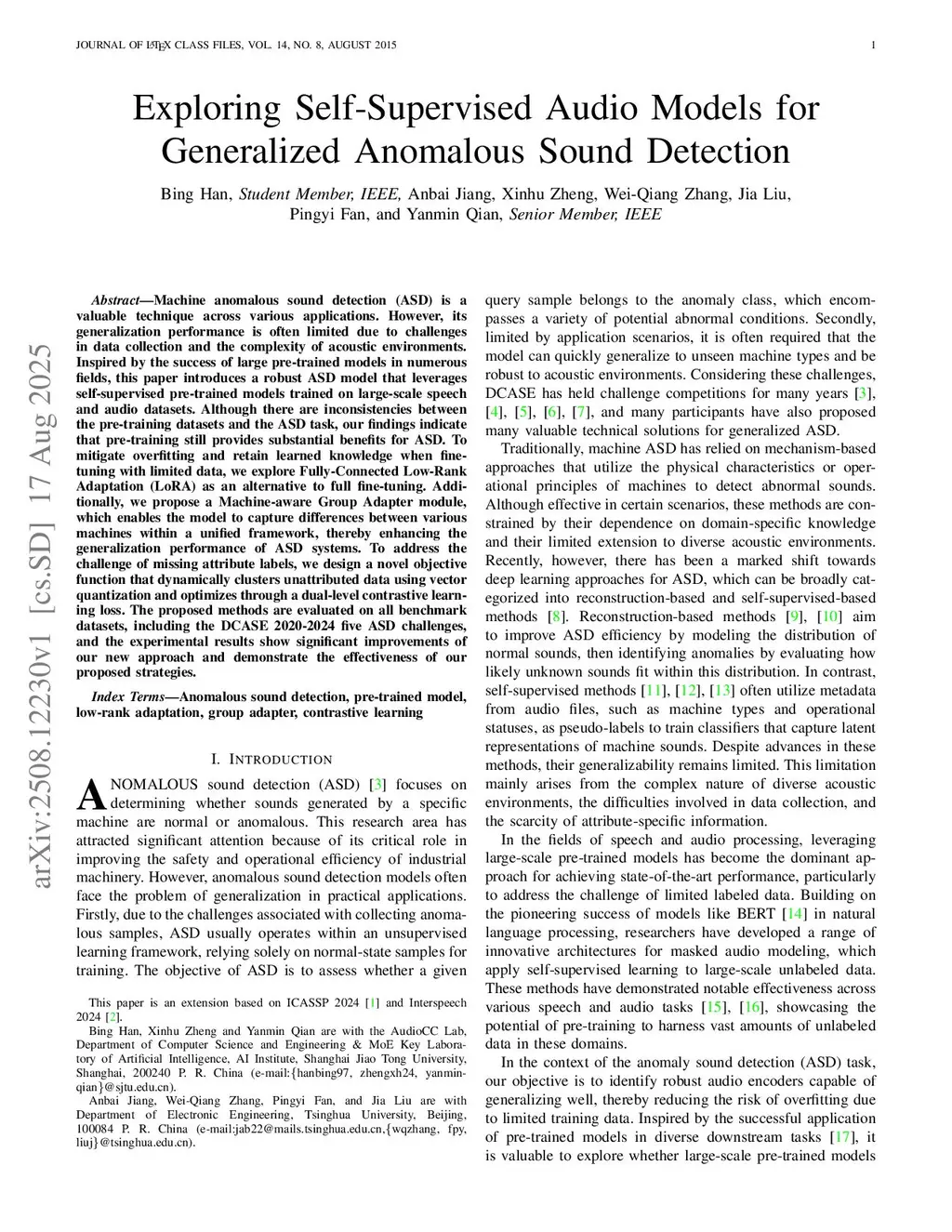 Machine anomalous sound detection (ASD) is a valuable technique across various applications. However, its generalization performance is often limited due to challenges in data collection and the complexity of acoustic environments. Inspired by the success of large pre-trained models in numerous fields, this paper introduces a robust ASD model that leverages self-supervised pre-trained models trained on large-scale speech and audio datasets. Although there are inconsistencies between the pre-training datasets and the ASD task, our findings indicate that pre-training still provides substantial benefits for ASD. To mitigate overfitting and retain learned knowledge when fine-tuning with limited data, we explore Fully-Connected Low-Rank Adaptation (LoRA) as an alternative to full fine-tuning. Additionally, we propose a Machine-aware Group Adapter module, which enables the model to capture differences between various machines within a unified framework, thereby enhancing the generalization performance of ASD systems. To address the challenge of missing attribute labels, we design a novel objective function that dynamically clusters unattributed data using vector quantization and optimizes through a dual-level contrastive learning loss. The proposed methods are evaluated on all benchmark datasets, including the DCASE 2020-2024 five ASD challenges, and the experimental results show significant improvements of our new approach and demonstrate the effectiveness of our proposed strategies.