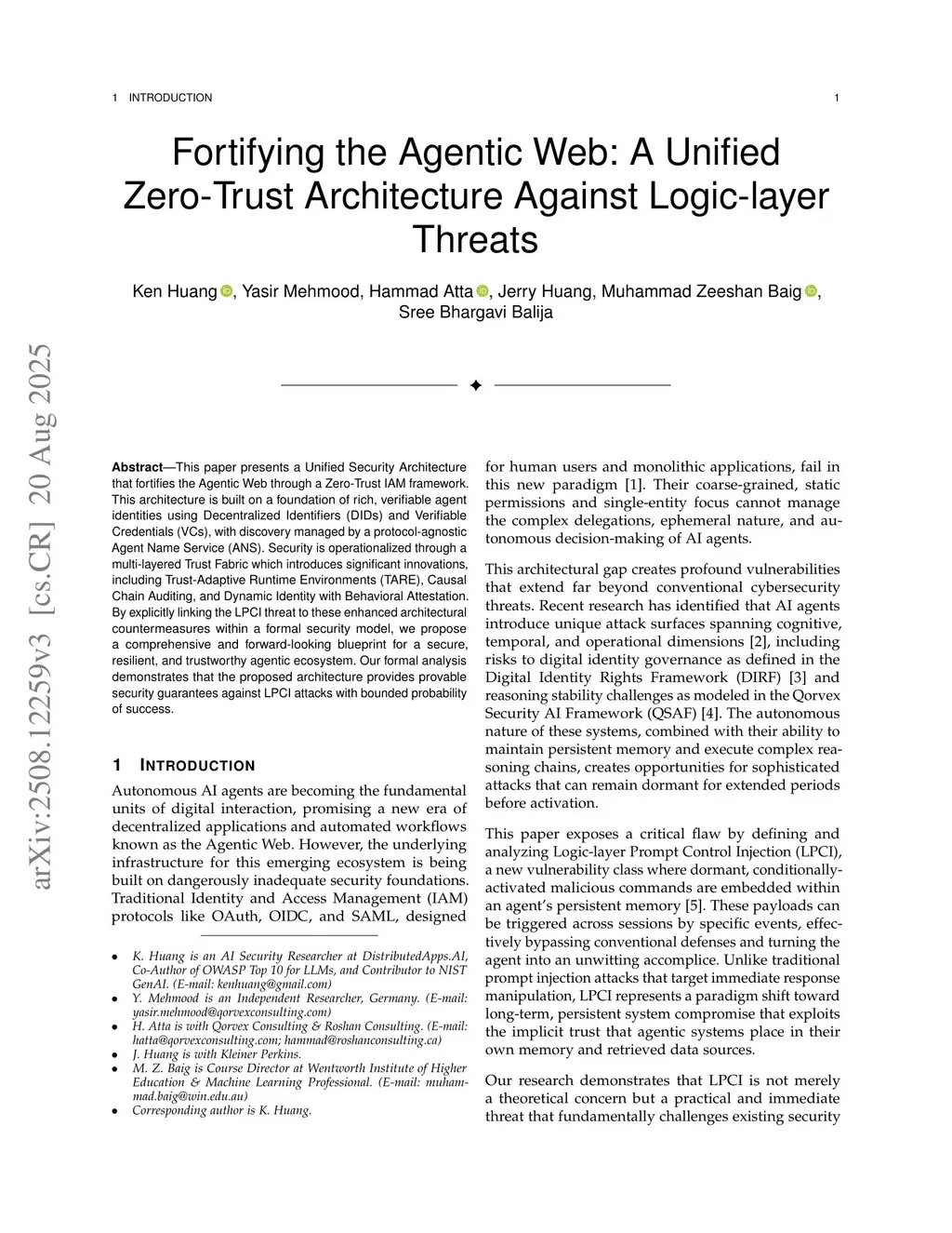 This paper presents a Unified Security Architecture that fortifies the Agentic Web through a Zero-Trust IAM framework. This architecture is built on a foundation of rich, verifiable agent identities using Decentralized Identifiers (DIDs) and Verifiable Credentials (VCs), with discovery managed by a protocol-agnostic Agent Name Service (ANS). Security is operationalized through a multi-layered Trust Fabric which introduces significant innovations, including Trust-Adaptive Runtime Environments (TARE), Causal Chain Auditing, and Dynamic Identity with Behavioral Attestation. By explicitly linking the LPCI threat to these enhanced architectural countermeasures within a formal security model, we propose a comprehensive and forward-looking blueprint for a secure, resilient, and trustworthy agentic ecosystem. Our formal analysis demonstrates that the proposed architecture provides provable security guarantees against LPCI attacks with bounded probability of success.