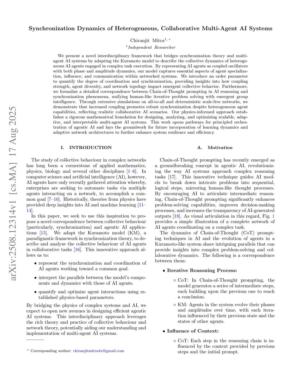 We present a novel interdisciplinary framework that bridges synchronization theory and multi-agent AI systems by adapting the Kuramoto model to describe the collective dynamics of heterogeneous AI agents engaged in complex task execution. By representing AI agents as coupled oscillators with both phase and amplitude dynamics, our model captures essential aspects of agent specialization, influence, and communication within networked systems. We introduce an order parameter to quantify the degree of coordination and synchronization, providing insights into how coupling strength, agent diversity, and network topology impact emergent collective behavior. Furthermore, we formalize a detailed correspondence between Chain-of-Thought prompting in AI reasoning and synchronization phenomena, unifying human-like iterative problem solving with emergent group intelligence. Through extensive simulations on all-to-all and deterministic scale-free networks, we demonstrate that increased coupling promotes robust synchronization despite heterogeneous agent capabilities, reflecting realistic collaborative AI scenarios. Our physics-informed approach establishes a rigorous mathematical foundation for designing, analyzing, and optimizing scalable, adaptive, and interpretable multi-agent AI systems. This work opens pathways for principled orchestration of agentic AI and lays the groundwork for future incorporation of learning dynamics and adaptive network architectures to further enhance system resilience and efficiency.