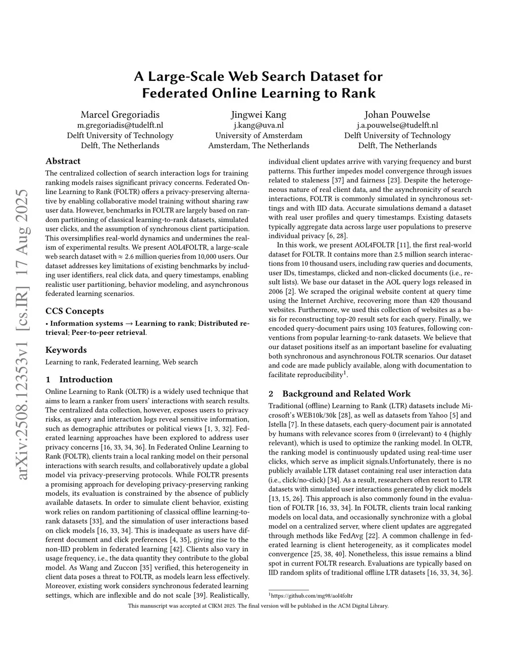 The centralized collection of search interaction logs for training ranking models raises significant privacy concerns. Federated Online Learning to Rank (FOLTR) offers a privacy-preserving alternative by enabling collaborative model training without sharing raw user data. However, benchmarks in FOLTR are largely based on random partitioning of classical learning-to-rank datasets, simulated user clicks, and the assumption of synchronous client participation. This oversimplifies real-world dynamics and undermines the realism of experimental results. We present AOL4FOLTR, a large-scale web search dataset with 2.6 million queries from 10,000 users. Our dataset addresses key limitations of existing benchmarks by including user identifiers, real click data, and query timestamps, enabling realistic user partitioning, behavior modeling, and asynchronous federated learning scenarios.