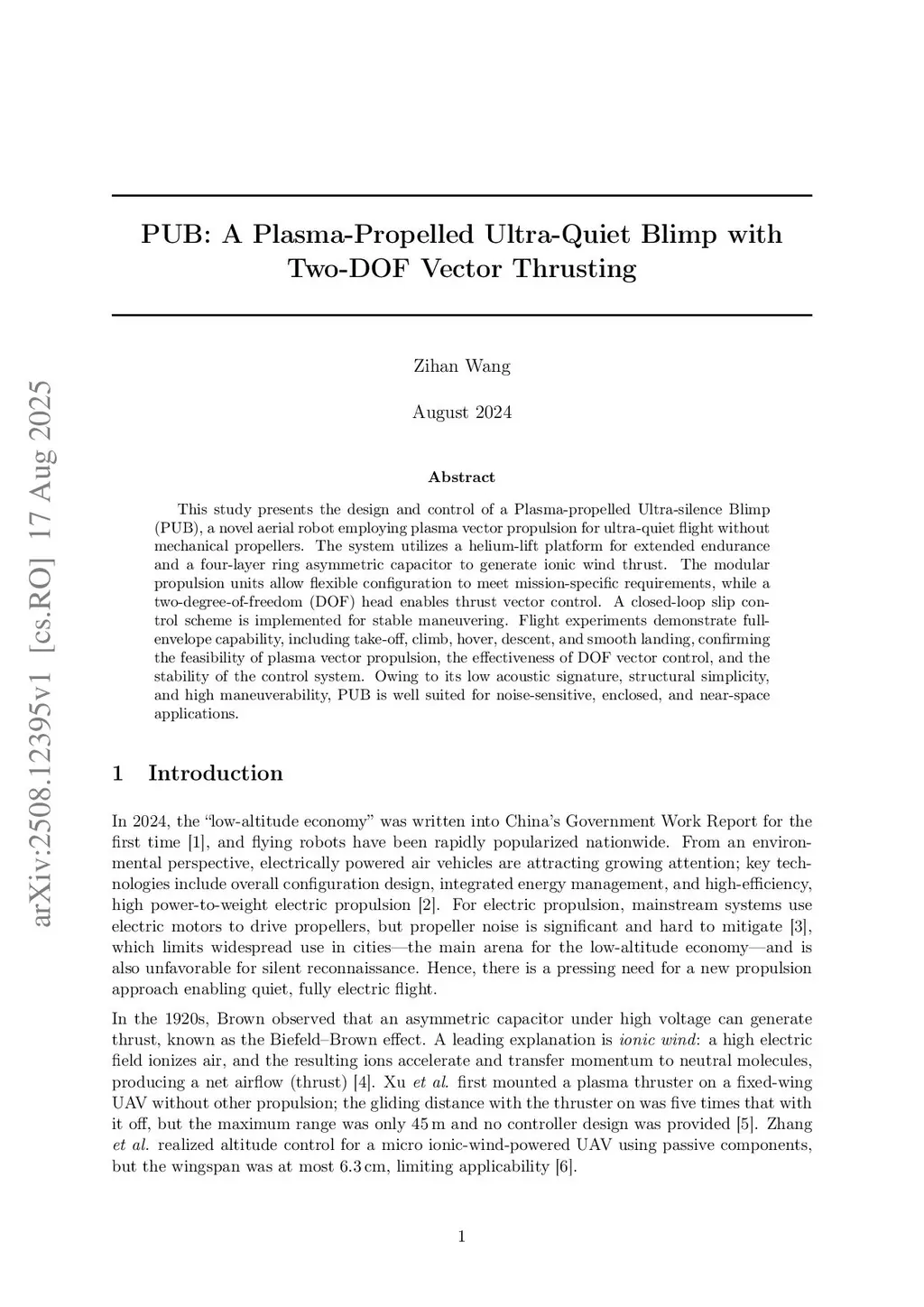 This study presents the design and control of a Plasma-propelled Ultra-silence Blimp (PUB), a novel aerial robot employing plasma vector propulsion for ultra-quiet flight without mechanical propellers. The system utilizes a helium-lift platform for extended endurance and a four-layer ring asymmetric capacitor to generate ionic wind thrust. The modular propulsion units allow flexible configuration to meet mission-specific requirements, while a two-degree-of-freedom (DOF) head enables thrust vector control. A closed-loop slip control scheme is implemented for stable maneuvering. Flight experiments demonstrate full-envelope capability, including take-off, climb, hover, descent, and smooth landing, confirming the feasibility of plasma vector propulsion, the effectiveness of DOF vector control, and the stability of the control system. Owing to its low acoustic signature, structural simplicity, and high maneuverability, PUB is well suited for noise-sensitive, enclosed, and near-space applications.