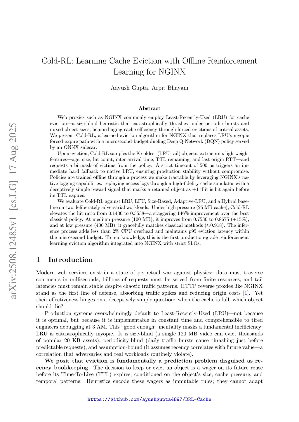 Web proxies such as NGINX commonly rely on least-recently-used (LRU) eviction, which is size agnostic and can thrash under periodic bursts and mixed object sizes. We introduce Cold-RL, a learned eviction policy for NGINX that replaces LRU's forced-expire path with a dueling Deep Q-Network served by an ONNX sidecar within a strict microsecond budget. On each eviction, Cold-RL samples the K least-recently-used objects, extracts six lightweight features (age, size, hit count, inter-arrival time, remaining TTL, and last origin RTT), and requests a bitmask of victims; a hard timeout of 500 microseconds triggers immediate fallback to native LRU. Policies are trained offline by replaying NGINX access logs through a cache simulator with a simple reward: a retained object earns one point if it is hit again before TTL expiry. We compare against LRU, LFU, size-based, adaptive LRU, and a hybrid baseline on two adversarial workloads. With a 25 MB cache, Cold-RL raises hit ratio from 0.1436 to 0.3538, a 146 percent improvement over the best classical baseline; at 100 MB, from 0.7530 to 0.8675, a 15 percent gain; and at 400 MB it matches classical methods (about 0.918). Inference adds less than 2 percent CPU overhead and keeps 95th percentile eviction latency within budget. To our knowledge, this is the first reinforcement learning eviction policy integrated into NGINX with strict SLOs.