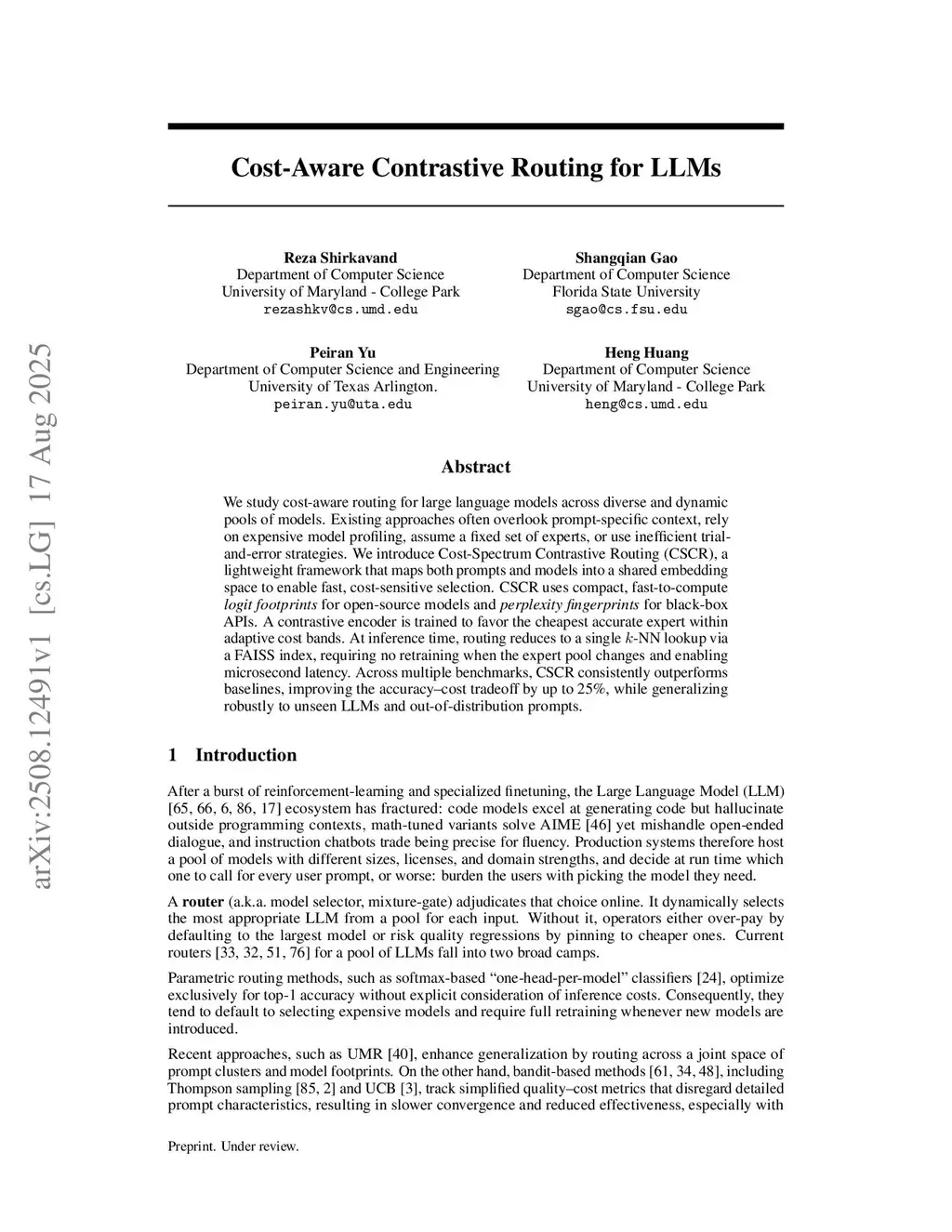 We study cost-aware routing for large language models across diverse and dynamic pools of models. Existing approaches often overlook prompt-specific context, rely on expensive model profiling, assume a fixed set of experts, or use inefficient trial-and-error strategies. We introduce Cost-Spectrum Contrastive Routing (CSCR), a lightweight framework that maps both prompts and models into a shared embedding space to enable fast, cost-sensitive selection. CSCR uses compact, fast-to-compute logit footprints for open-source models and perplexity fingerprints for black-box APIs. A contrastive encoder is trained to favor the cheapest accurate expert within adaptive cost bands. At inference time, routing reduces to a single k-NN lookup via a FAISS index, requiring no retraining when the expert pool changes and enabling microsecond latency. Across multiple benchmarks, CSCR consistently outperforms baselines, improving the accuracy-cost tradeoff by up to 25%, while generalizing robustly to unseen LLMs and out-of-distribution prompts.
