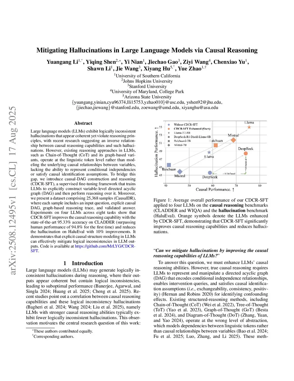 Large language models (LLMs) exhibit logically inconsistent hallucinations that appear coherent yet violate reasoning principles, with recent research suggesting an inverse relationship between causal reasoning capabilities and such hallucinations. However, existing reasoning approaches in LLMs, such as Chain-of-Thought (CoT) and its graph-based variants, operate at the linguistic token level rather than modeling the underlying causal relationships between variables, lacking the ability to represent conditional independencies or satisfy causal identification assumptions. To bridge this gap, we introduce causal-DAG construction and reasoning (CDCR-SFT), a supervised fine-tuning framework that trains LLMs to explicitly construct variable-level directed acyclic graph (DAG) and then perform reasoning over it. Moreover, we present a dataset comprising 25,368 samples (CausalDR), where each sample includes an input question, explicit causal DAG, graph-based reasoning trace, and validated answer. Experiments on four LLMs across eight tasks show that CDCR-SFT improves the causal reasoning capability with the state-of-the-art 95.33% accuracy on CLADDER (surpassing human performance of 94.8% for the first time) and reduces the hallucination on HaluEval with 10% improvements. It demonstrates that explicit causal structure modeling in LLMs can effectively mitigate logical inconsistencies in LLM outputs. Code is available atthis https URL.