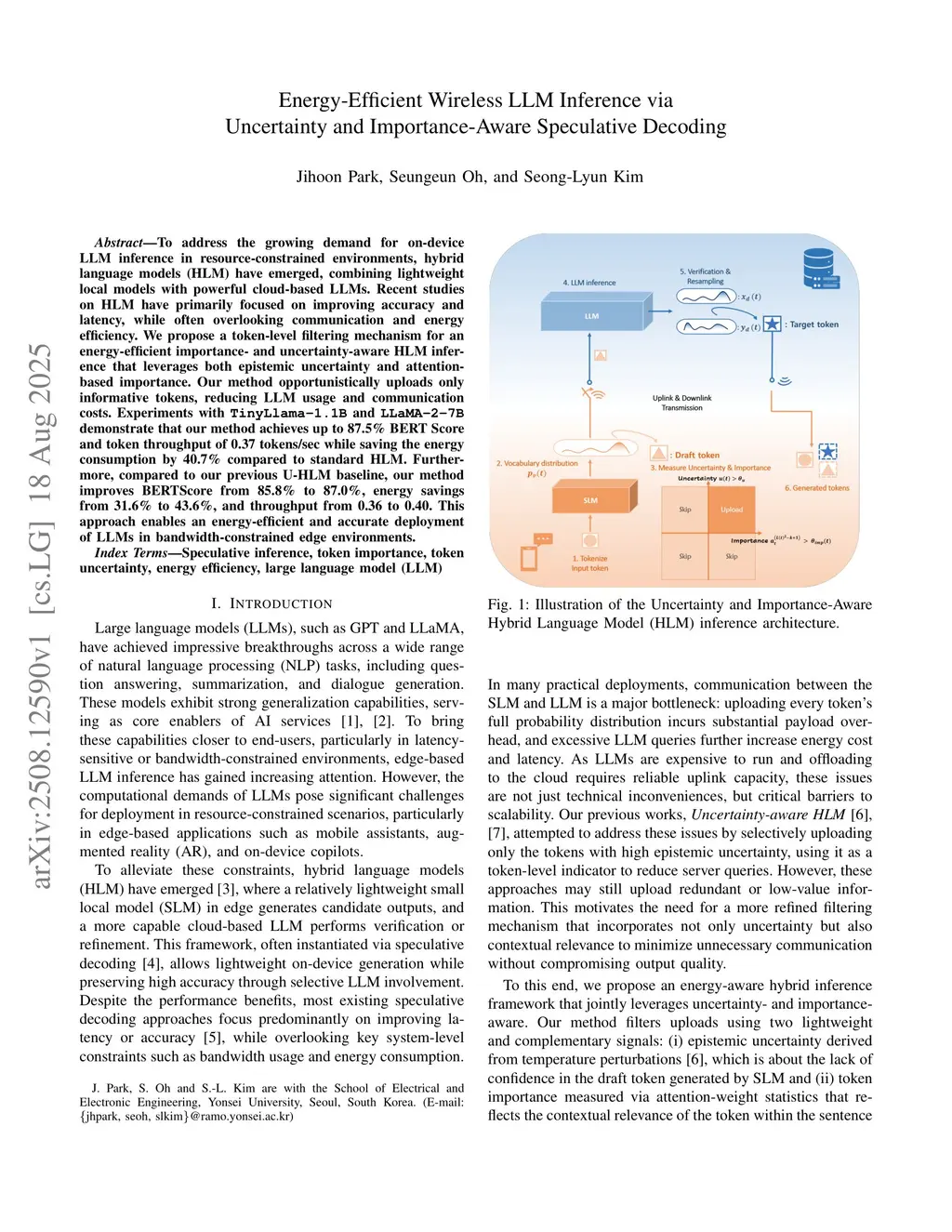 To address the growing demand for on-device LLM inference in resource-constrained environments, hybrid language models (HLM) have emerged, combining lightweight local models with powerful cloud-based LLMs. Recent studies on HLM have primarily focused on improving accuracy and latency, while often overlooking communication and energy efficiency. We propose a token-level filtering mechanism for an energy-efficient importance- and uncertainty-aware HLM inference that leverages both epistemic uncertainty and attention-based importance. Our method opportunistically uploads only informative tokens, reducing LLM usage and communication costs. Experiments with TinyLlama-1.1B and LLaMA-2-7B demonstrate that our method achieves up to 87.5% BERT Score and token throughput of 0.37 tokens/sec while saving the energy consumption by 40.7% compared to standard HLM. Furthermore, compared to our previous U-HLM baseline, our method improves BERTScore from 85.8% to 87.0%, energy savings from 31.6% to 43.6%, and throughput from 0.36 to 0.40. This approach enables an energy-efficient and accurate deployment of LLMs in bandwidth-constrained edge environments.