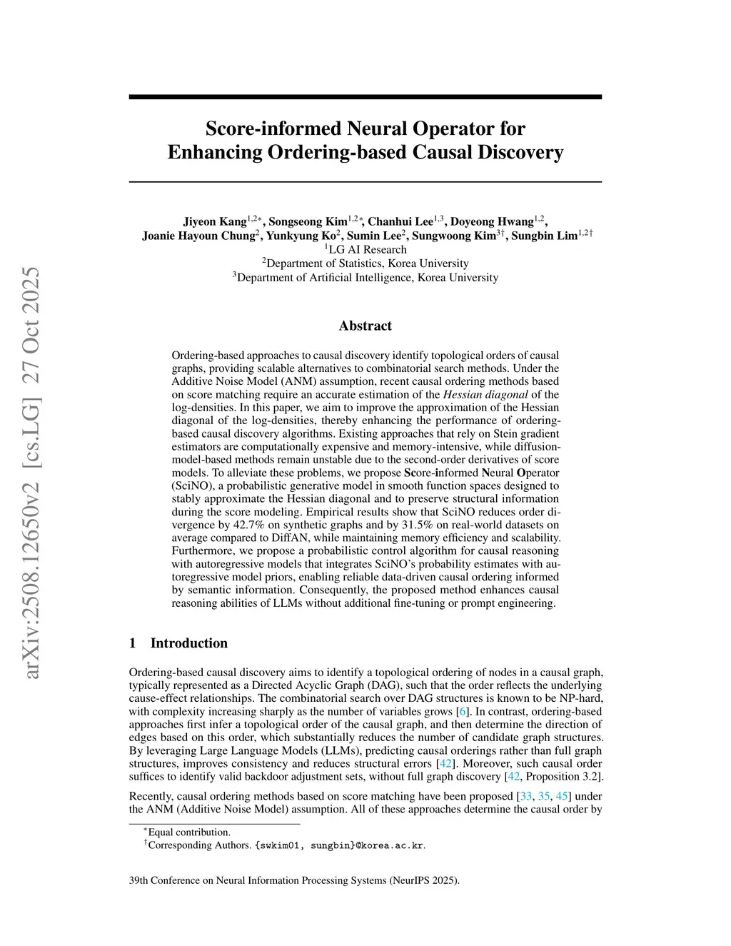 Ordering-based approaches to causal discovery identify topological orders of causal graphs, providing scalable alternatives to combinatorial search methods. Under the Additive Noise Model (ANM) assumption, recent causal ordering methods based on score matching require an accurate estimation of the Hessian diagonal of the log-densities. In this paper, we aim to improve the approximation of the Hessian diagonal of the log-densities, thereby enhancing the performance of ordering-based causal discovery algorithms. Existing approaches that rely on Stein gradient estimators are computationally expensive and memory-intensive, while diffusion-model-based methods remain unstable due to the second-order derivatives of score models. To alleviate these problems, we propose Score-informed Neural Operator (SciNO), a probabilistic generative model in smooth function spaces designed to stably approximate the Hessian diagonal and to preserve structural information during the score modeling. Empirical results show that SciNO reduces order divergence by 42.7% on synthetic graphs and by 31.5% on real-world datasets on average compared to DiffAN, while maintaining memory efficiency and scalability. Furthermore, we propose a probabilistic control algorithm for causal reasoning with autoregressive models that integrates SciNO's probability estimates with autoregressive model priors, enabling reliable data-driven causal ordering informed by semantic information. Consequently, the proposed method enhances causal reasoning abilities of LLMs without additional fine-tuning or prompt engineering.